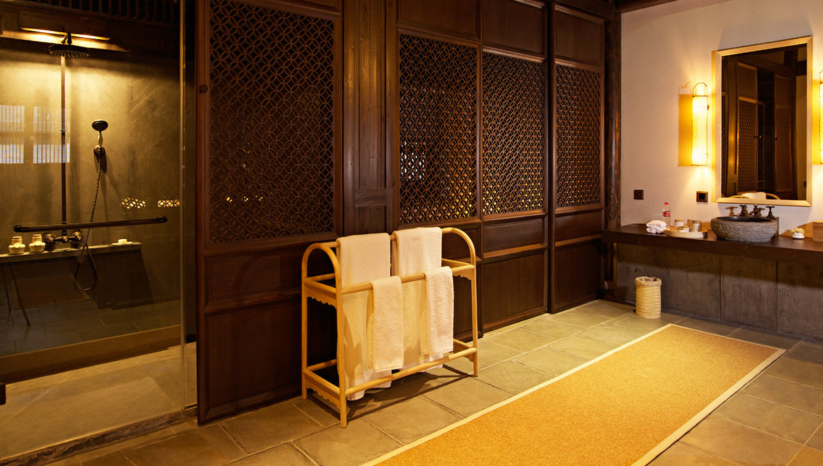 房间的设施准备的非常贴心,床头有可以直接放Iphone的Boss音箱,里面的CD悠然的放着古筝的乐曲。景德镇彩绘的小茶罐里面是上好的龙井,各种洗浴用品装在了土陶的小罐子里面,和石头的台盆相得益彰,纸罩的台灯把房间渲染的象点了蜡烛的古老屋舍,大柜里面窝心的准备了防蚊露以及出门带的草帽和草包(这个客人是可以带走留念的),墙壁上的墨宝据说也是特意选择的浙江本土书法家的作品,可见其设计上的匠心独具。发了个围脖,迅速回贴说:“看到这样的房间,想到的一定是外面下雨。”真神了,在这样的房间里喝茶品曲儿,外面是淅淅沥沥的雨,怎样的意境啊!