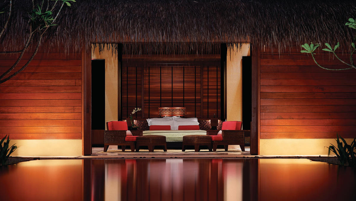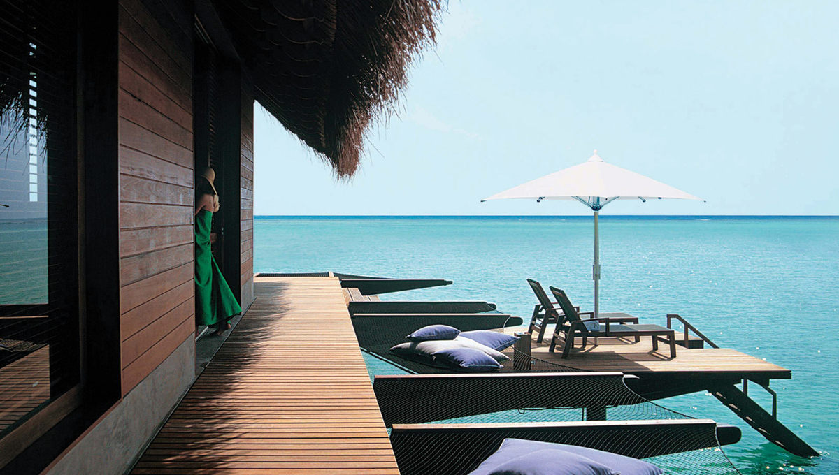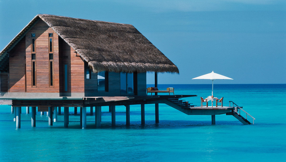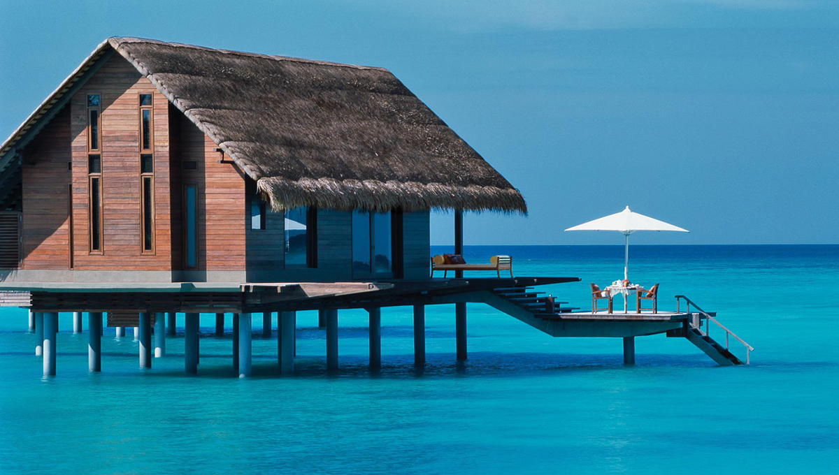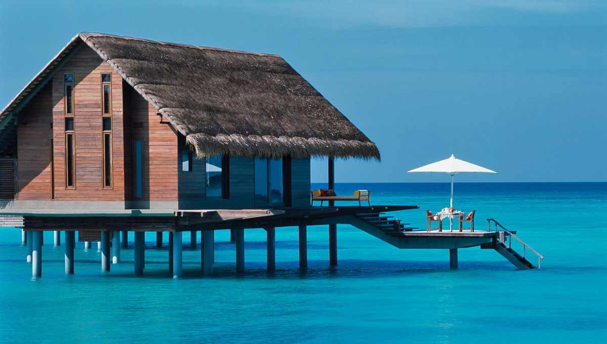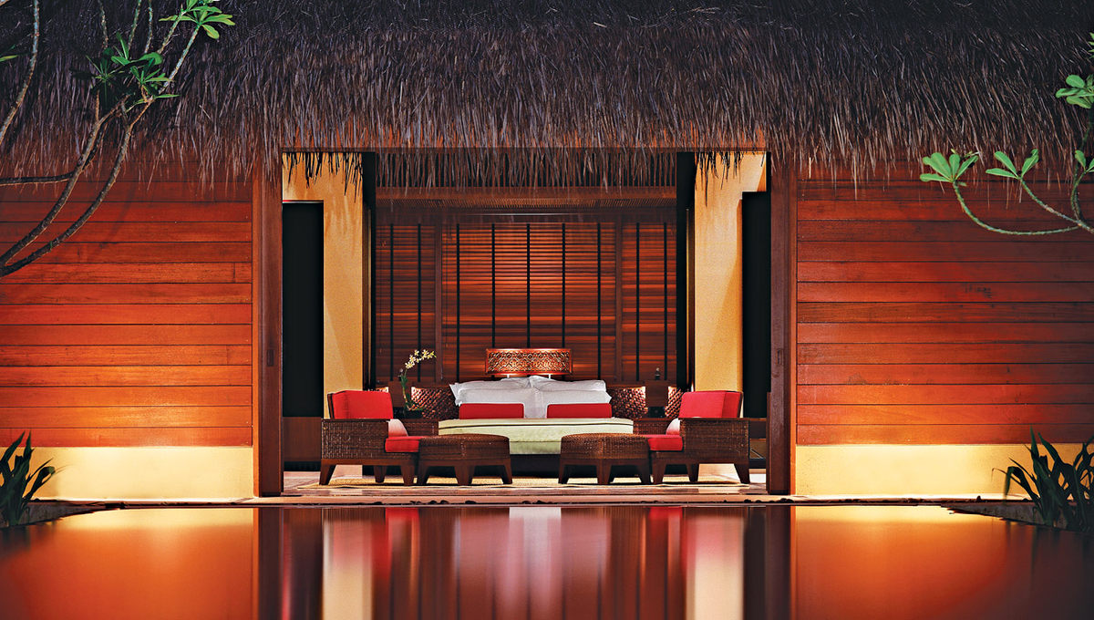 水上别墅有着教堂一样的通风高屋顶,国王床正对着大海,旁边摆放着2张座椅和一套书桌座椅。在浴室里,有可以随意挪动的花洒,独立浴缸,以及两个浮奢的水槽。走在房外,露天平台上摆放着可以欣赏全景的水上吊床,可以躺在上面晒晒日光浴或是发发呆,十分闲逸自在。房间特色设施:互动的卫星频道,立体声环绕系统,高速宽带上网,30厘米Posturepedic海豹床垫和300 thread-count缎,100%的埃及棉床单,丝绸与缎面的床垫,棉质床上用品,甲板阳光躺椅,双浴室及更衣室,超大水磨石浴缸,毛绒睡衣或棉质和服