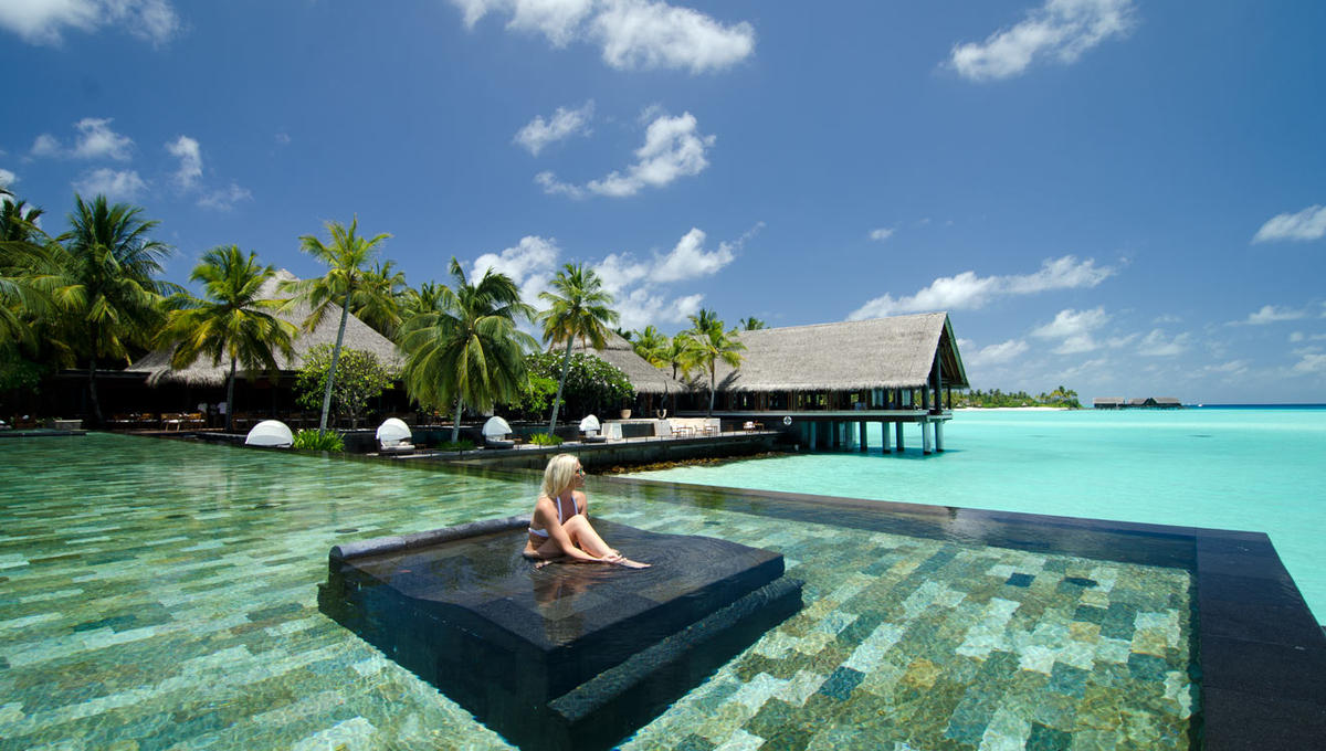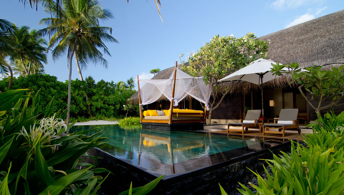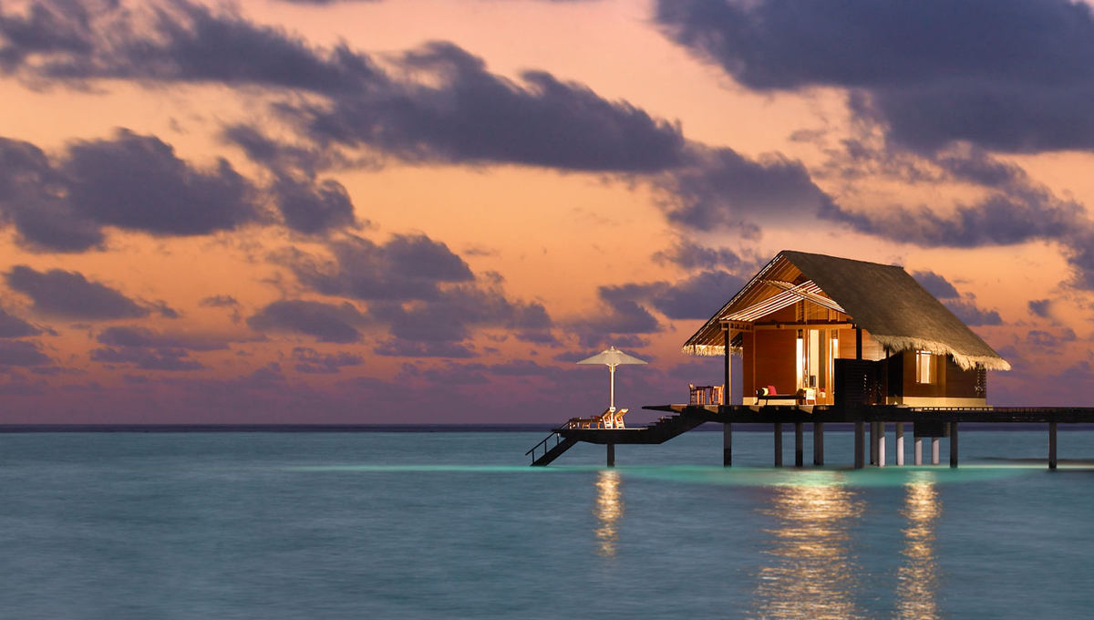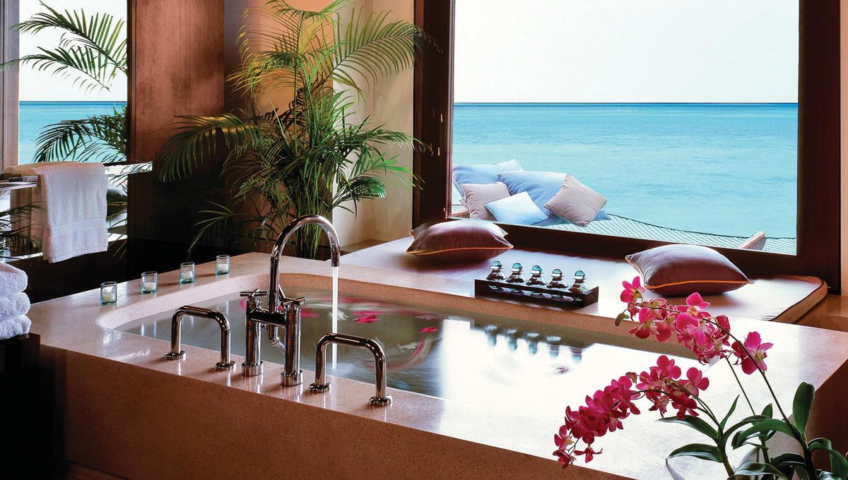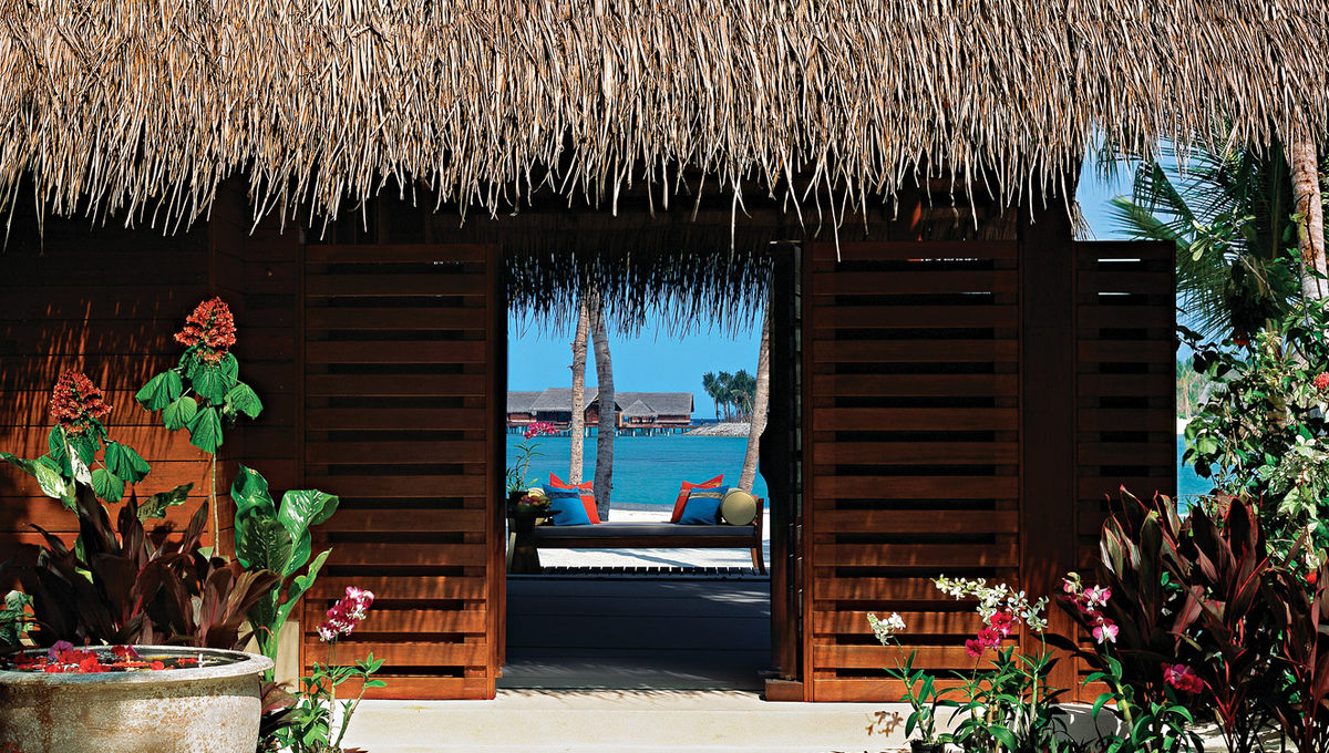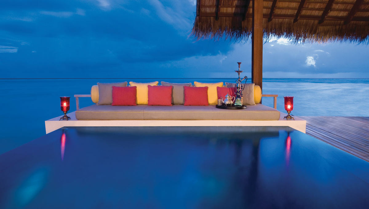 水上别墅有着教堂一样的通风高屋顶,国王床正对着大海,旁边摆放着2张座椅和一套书桌座椅。在浴室里,有可以随意挪动的花洒,独立浴缸,以及两个浮奢的水槽。走在房外,露天平台上摆放着可以欣赏全景的水上吊床,可以躺在上面晒晒日光浴或是发发呆,十分闲逸自在。房间特色设施:互动的卫星频道,立体声环绕系统,高速宽带上网,30厘米Posturepedic海豹床垫和300 thread-count缎,100%的埃及棉床单,丝绸与缎面的床垫,棉质床上用品,甲板阳光躺椅,双浴室及更衣室,超大水磨石浴缸,毛绒睡衣或棉质和服