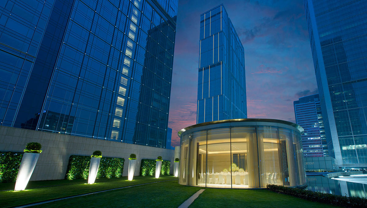 位于八楼的茵园礼堂附带水池,点缀着椭圆形玻璃环绕的绿意,设计高贵典雅,为设宴款待的来宾提供额外的活动空间。