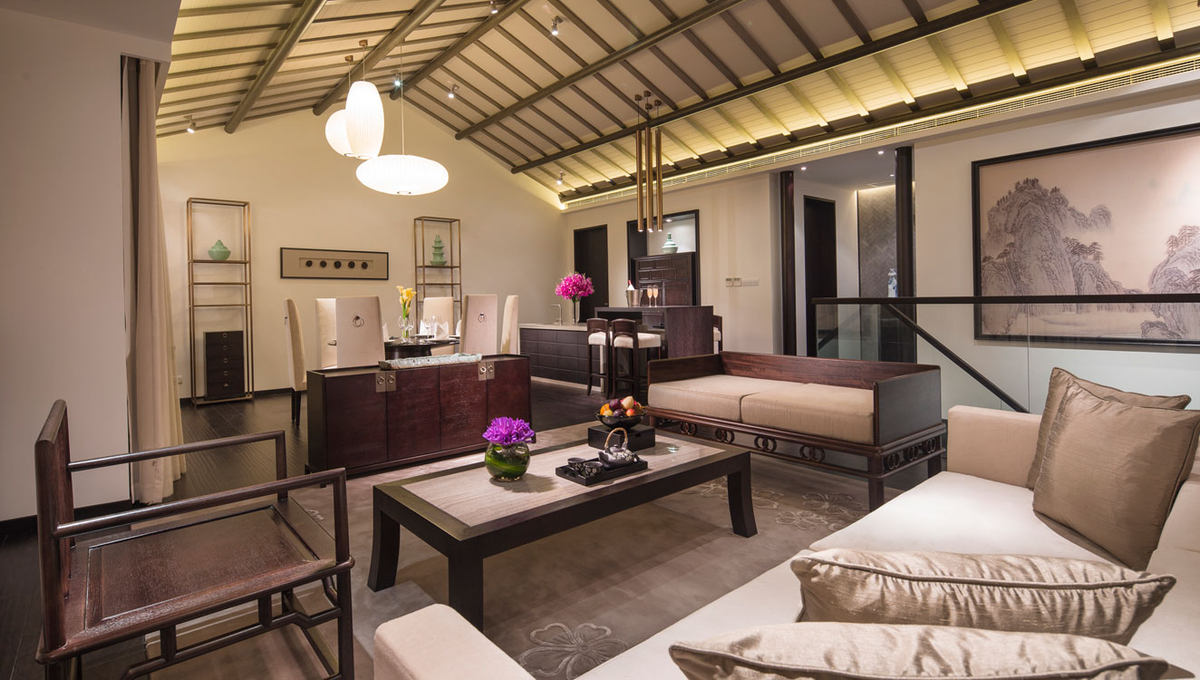 粉墙、黛瓦、马头墙是众所熟悉的徽派建筑特色,酒店的整体设计除了应用了这些建筑特色外,色感也延续了传统建筑的简约稳重,空间色调方面,整体清亮有泽,使空间温暖而现代。家具的选择上以明代家具为基础,舍掉过度的装饰,以利落线条来传达山居的简单自然,但还是保留中式的韵味,以及搭配舒适的材料触感。室内的设计风格着重于体现徽派建筑独特的美学,并融合了现代生活的设计观念;以四个字来贯穿整体空间——清、雅、朴、华。