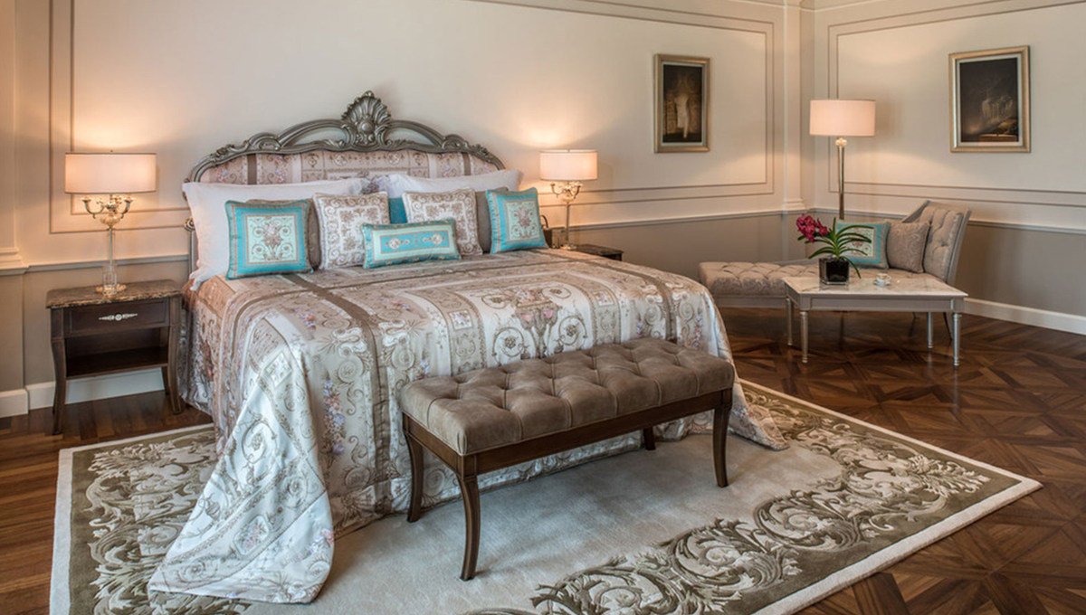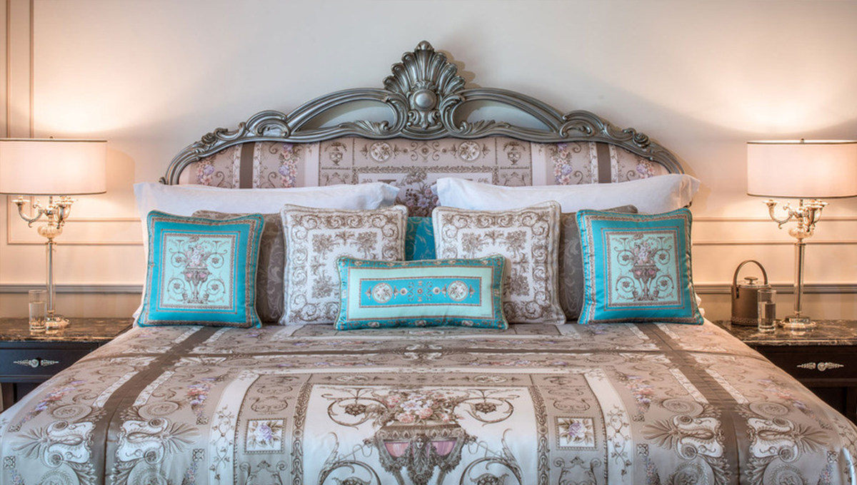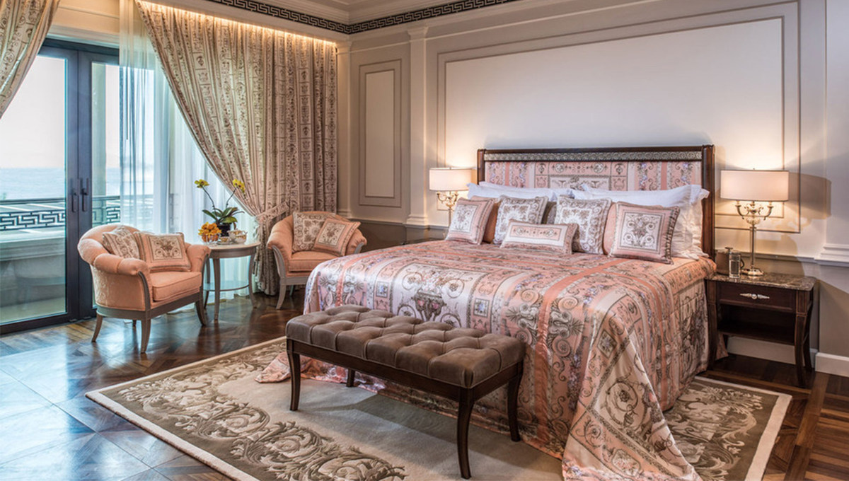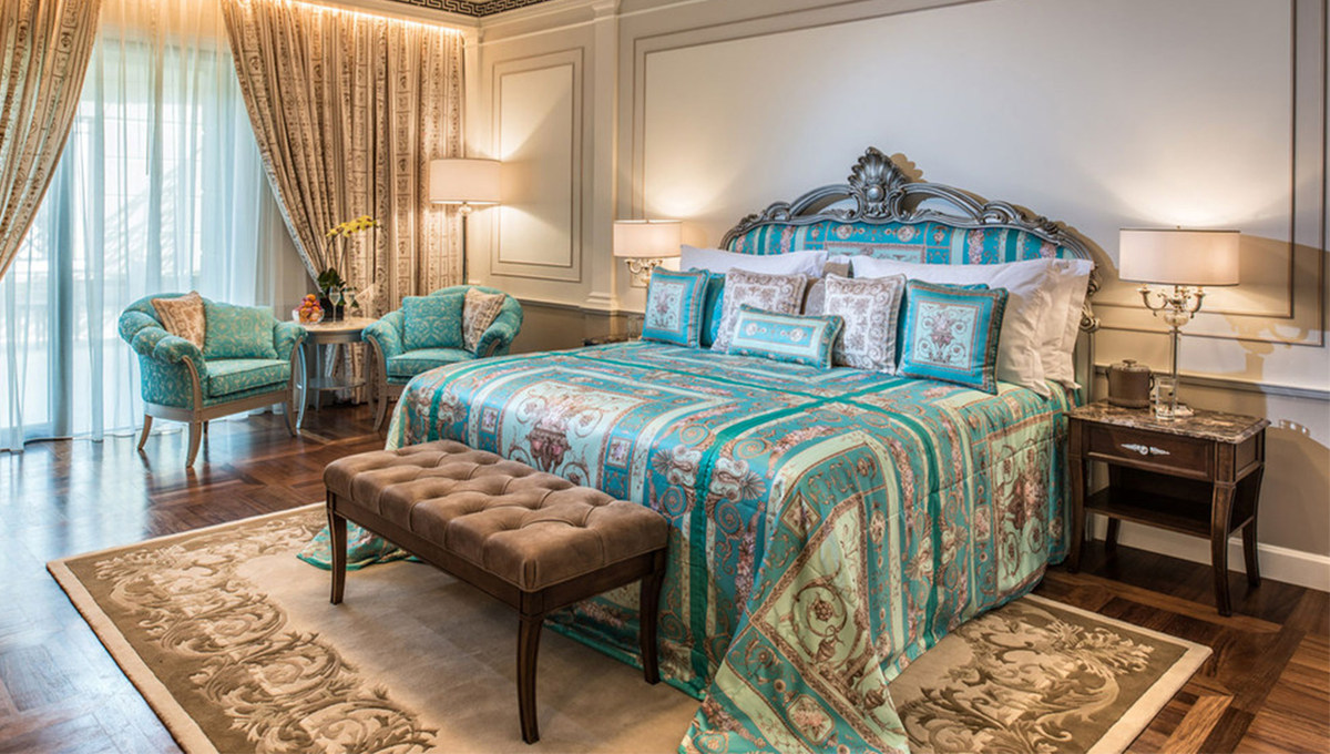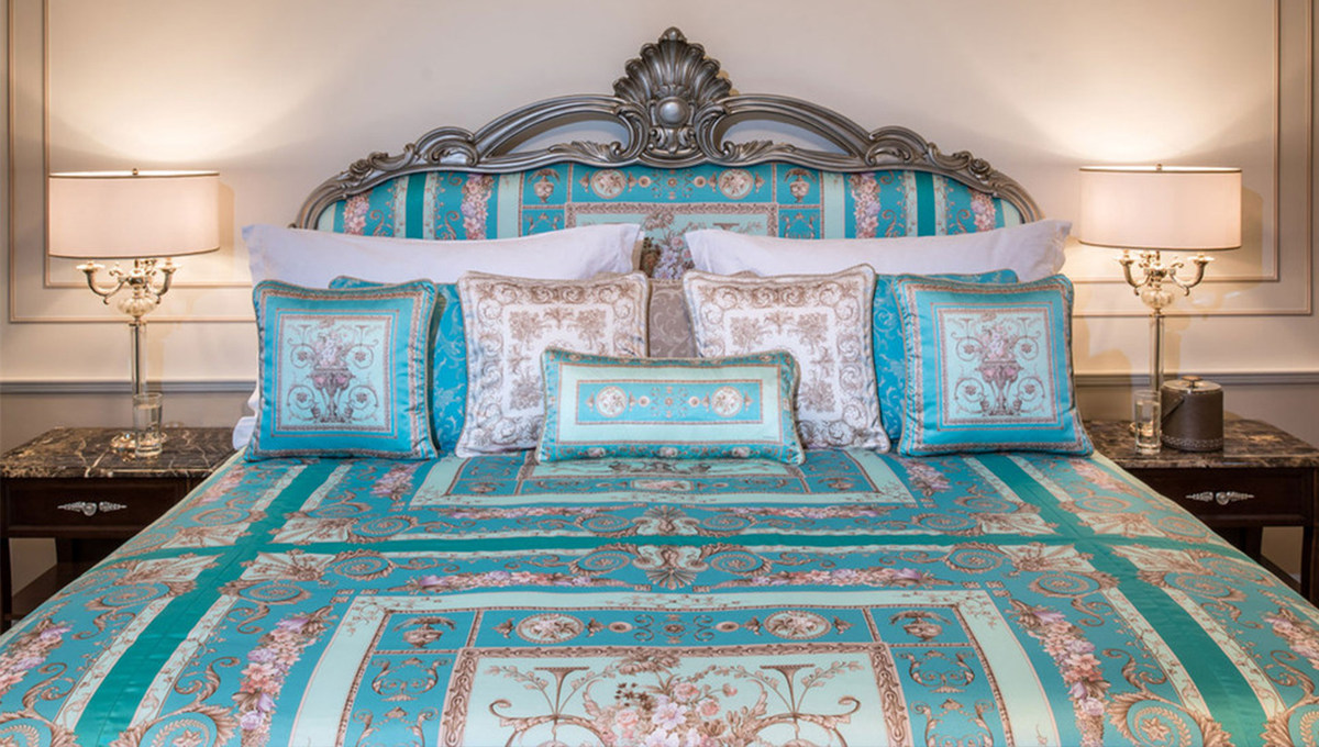 | 墙身均以不折不扣的手绘意大利图案粉饰,每一件家具和织物都由范思哲为酒店量身打造 |