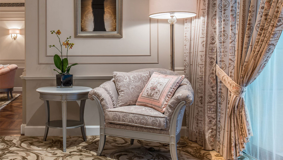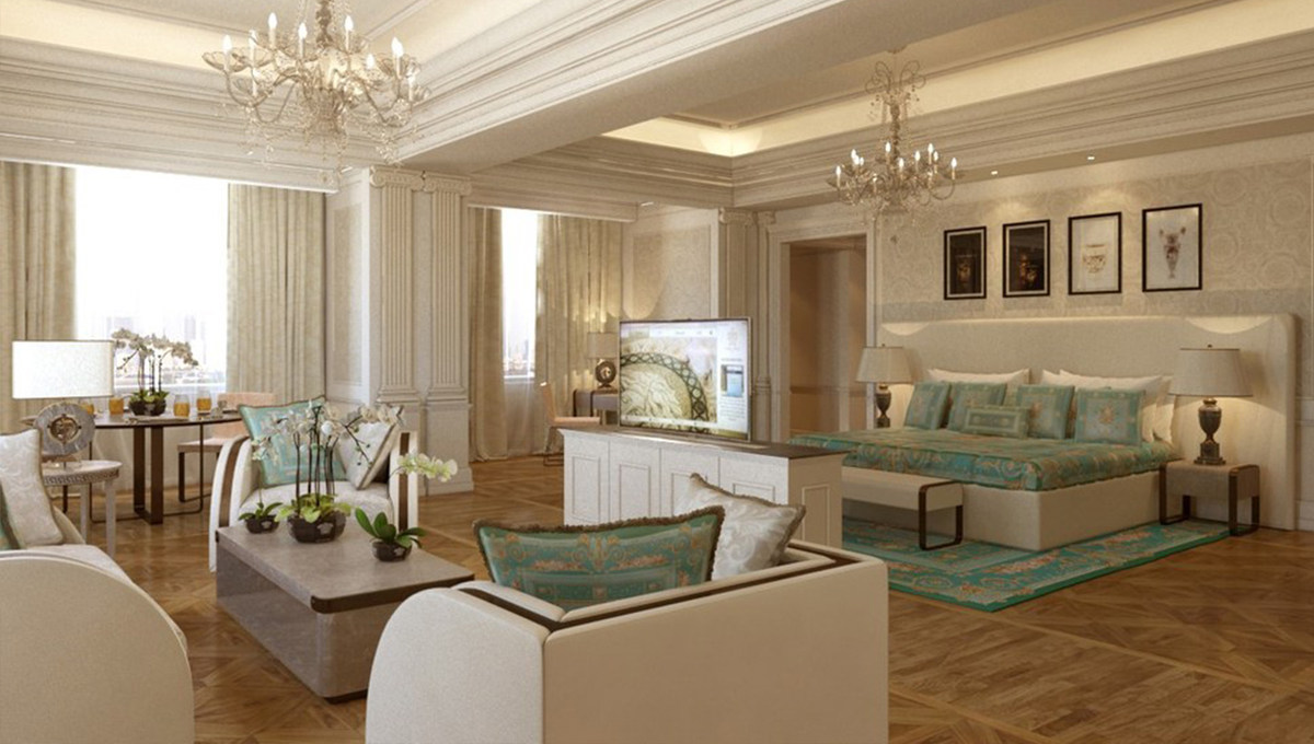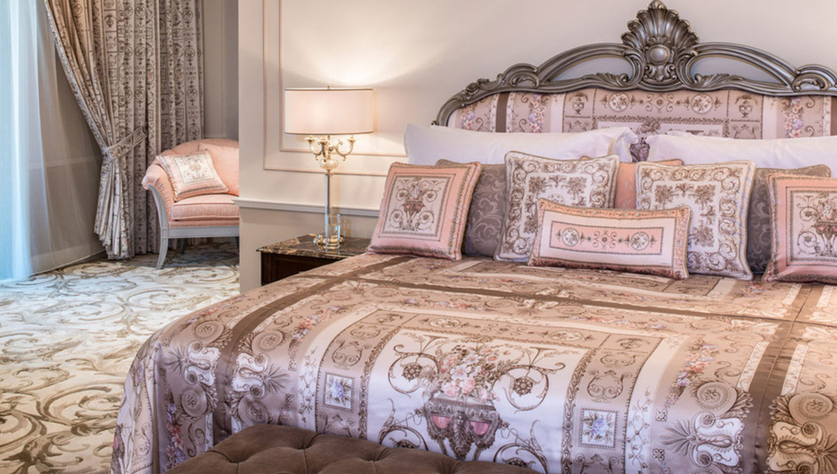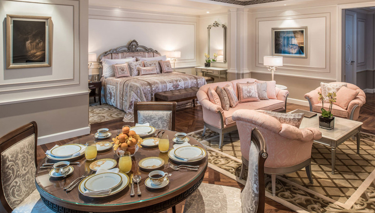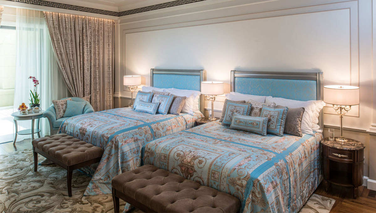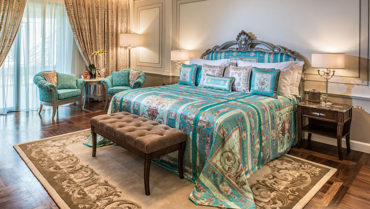 | 墙身均以不折不扣的手绘意大利图案粉饰,每一件家具和织物都由范思哲为酒店量身打造 |