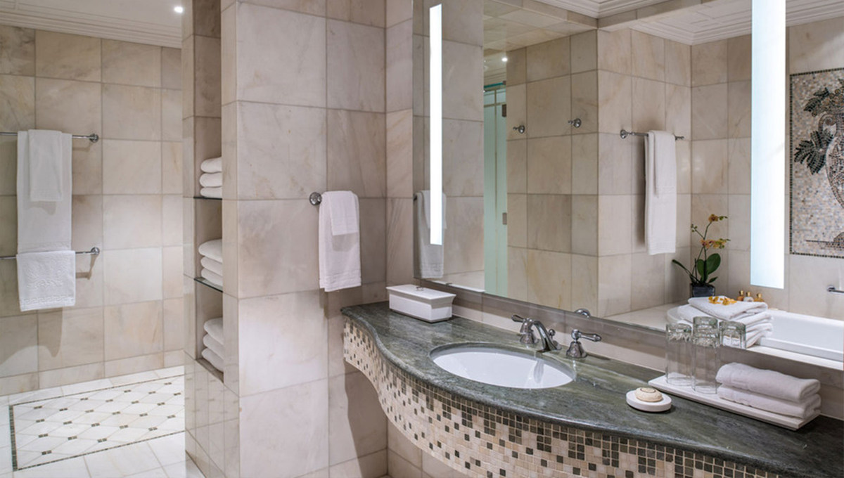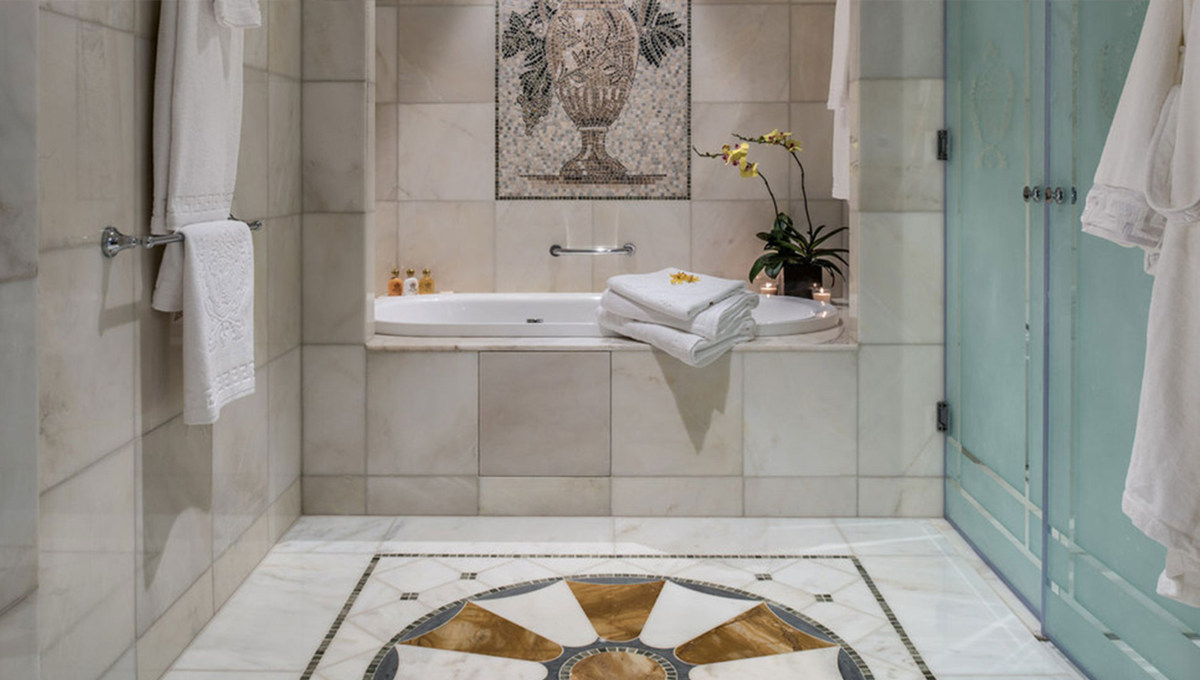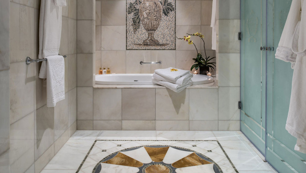 | 瑰丽豪华的大堂地面上1000平方米全部由工匠手制的顶级大理石马赛克 |