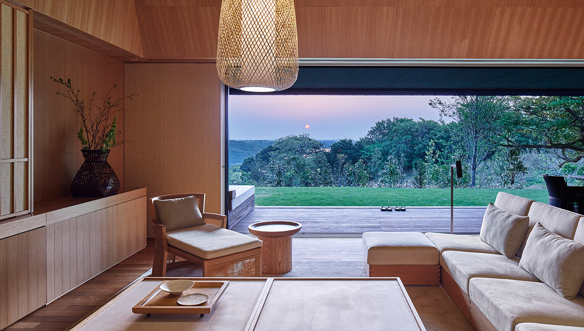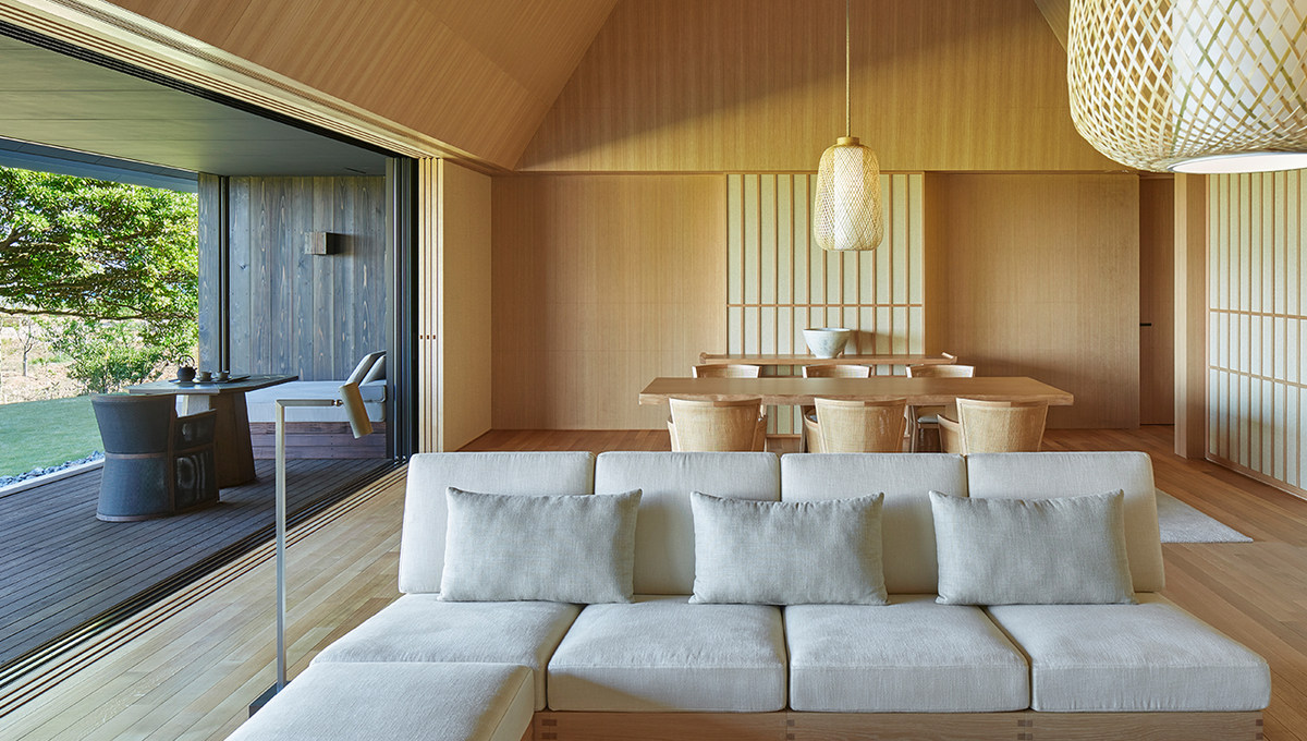 温馨的室内空间优雅而简约,用浅色调的日本木材精心打造。每个独立的套房都采用了落地窗设计,配备织物和木移门,可以从房间的一端移到另一端,让客人尽情欣赏度假村周围自然公园的景观。定制家具确保建筑和设计之间完美平衡,白色橡木咖啡桌、沙发和扶手椅与大地色织物的色调相得益彰。浴室采用了传统日本浴室的设计,炭黑色的玄武岩地砖将目光从房间引向设有落地窗的私人温泉,在这里客人可以一边泡汤一边欣赏私家花园的景致。饰品的数量被精简至最低,与日本室内设计传统相契合,以免扰乱注意力。因此客人可以专心享受传统日式泡浴的体验,用心体会这种独特的文化仪式。