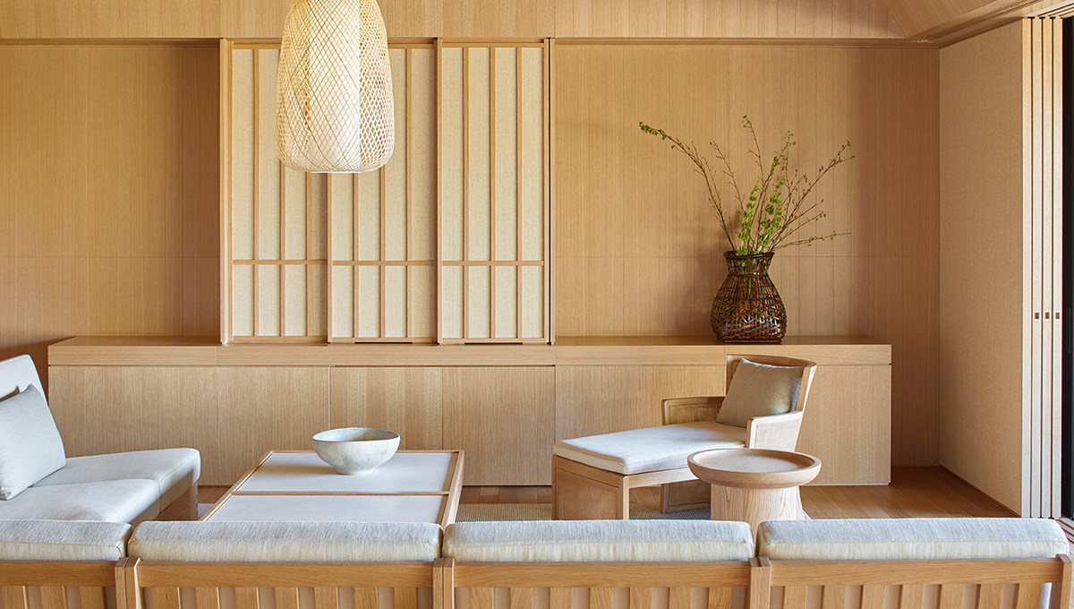 度假村里随处可见日本传统艺术作品,比如起源于日本飞鸟时代(Asuka Era,公元600-700)的精致Kumiko艺术品,这种工艺由匠人们代代相传,逐渐臻于完美。匠人运用巧夺天工的技艺将小木片拼缀起来,彼此之间用凿子连接,不用一颗钉子,也不用胶水黏合。值得一提的是,水疗中心和双卧室别墅还装饰着日本和服和腰带匠人 Genbei Yamaguchi独一无二的作品,他所在的家族在京都日本和服用腰带制作行业中作为掌舵者已达270年。墙面上装饰着Genbei设计的精美绝伦的和服宽腰带,仿佛是借由展示珍贵的传家宝来歌颂日本源远流长的传统。