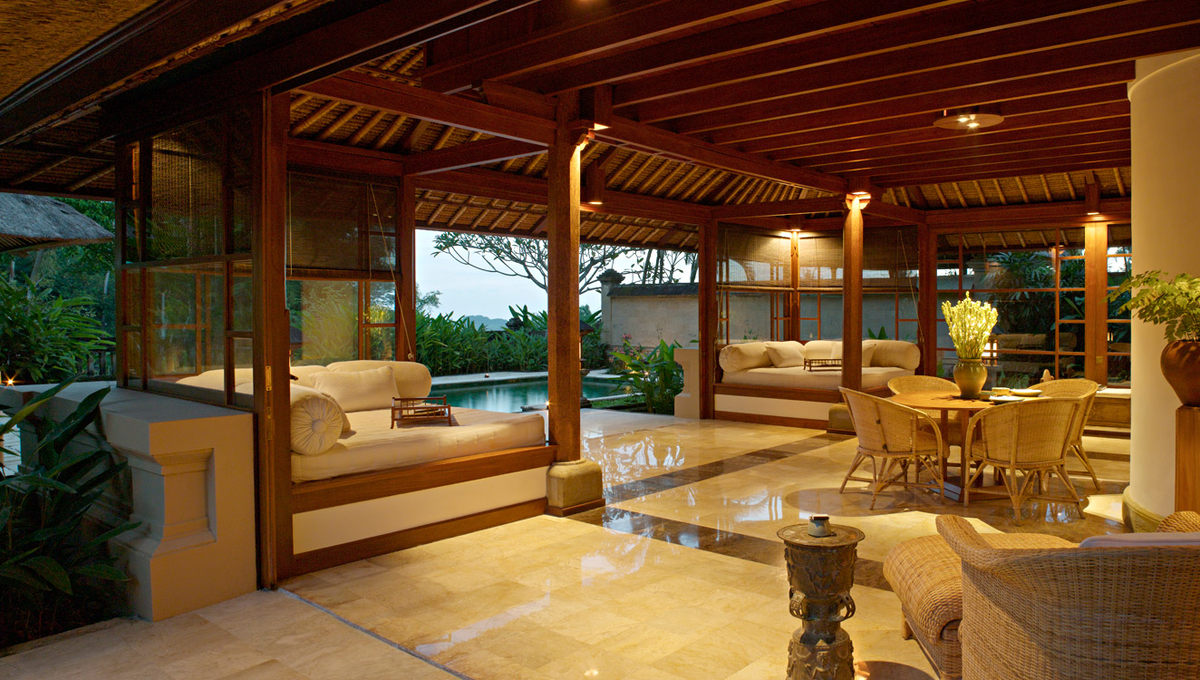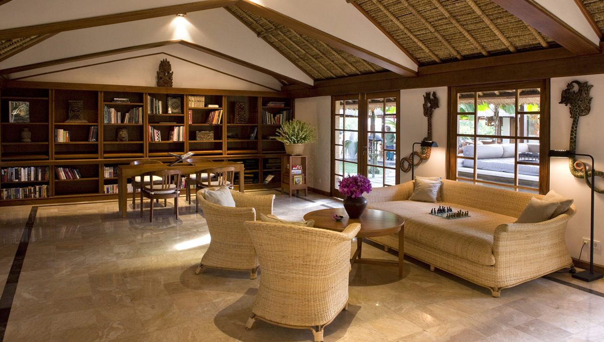 挑高的大堂采用巴厘岛传统茅草屋式的设计风格,以自然色调为主,采用椰子木和柚木搭建而成,铺有白茅草的竹制屋顶格外引人注目,这里也是当地居民的重要聚会场所。