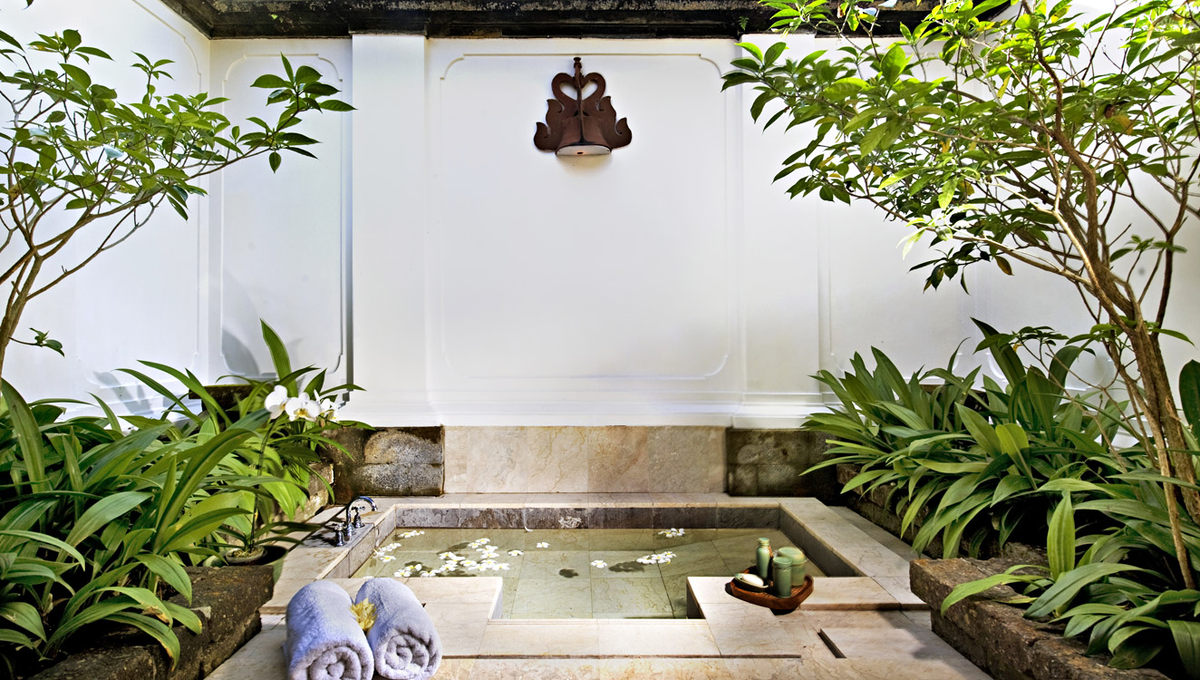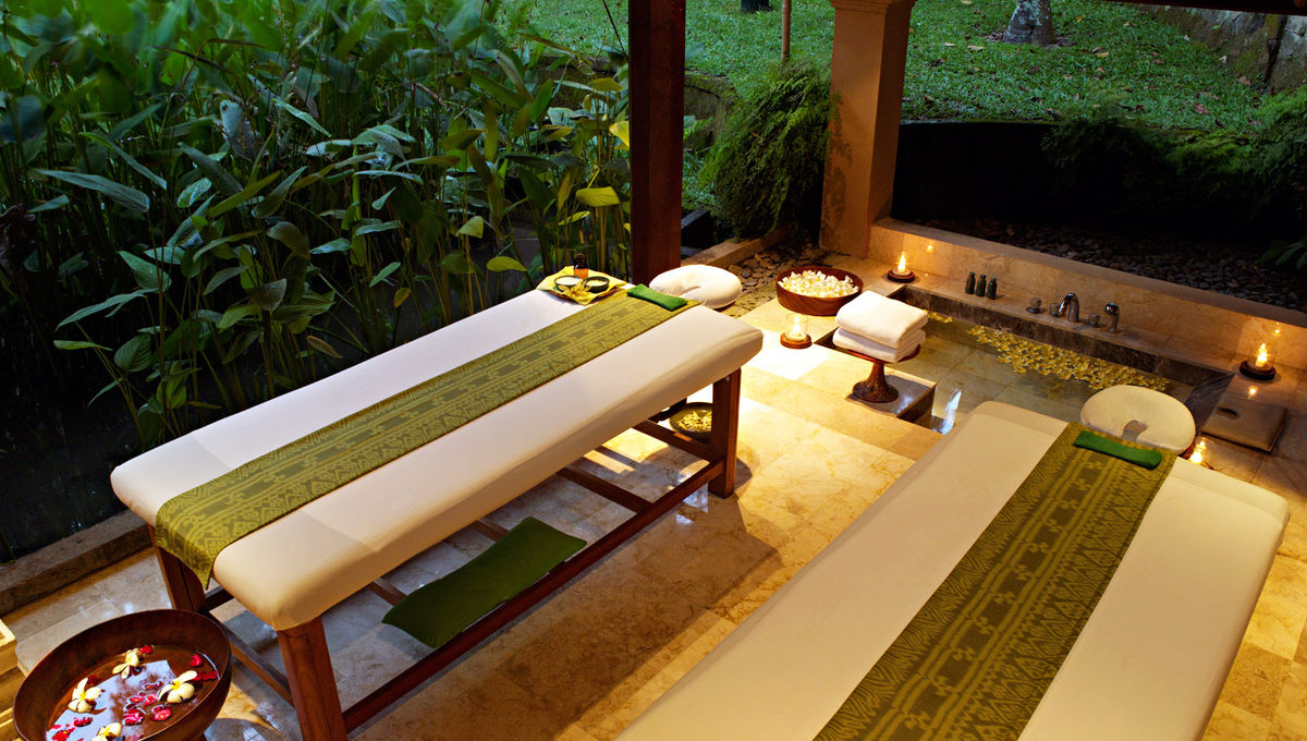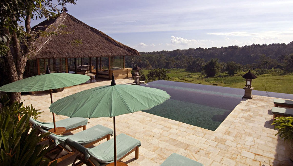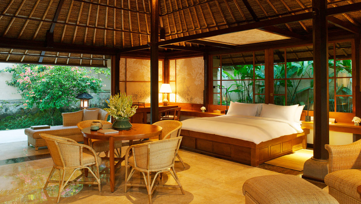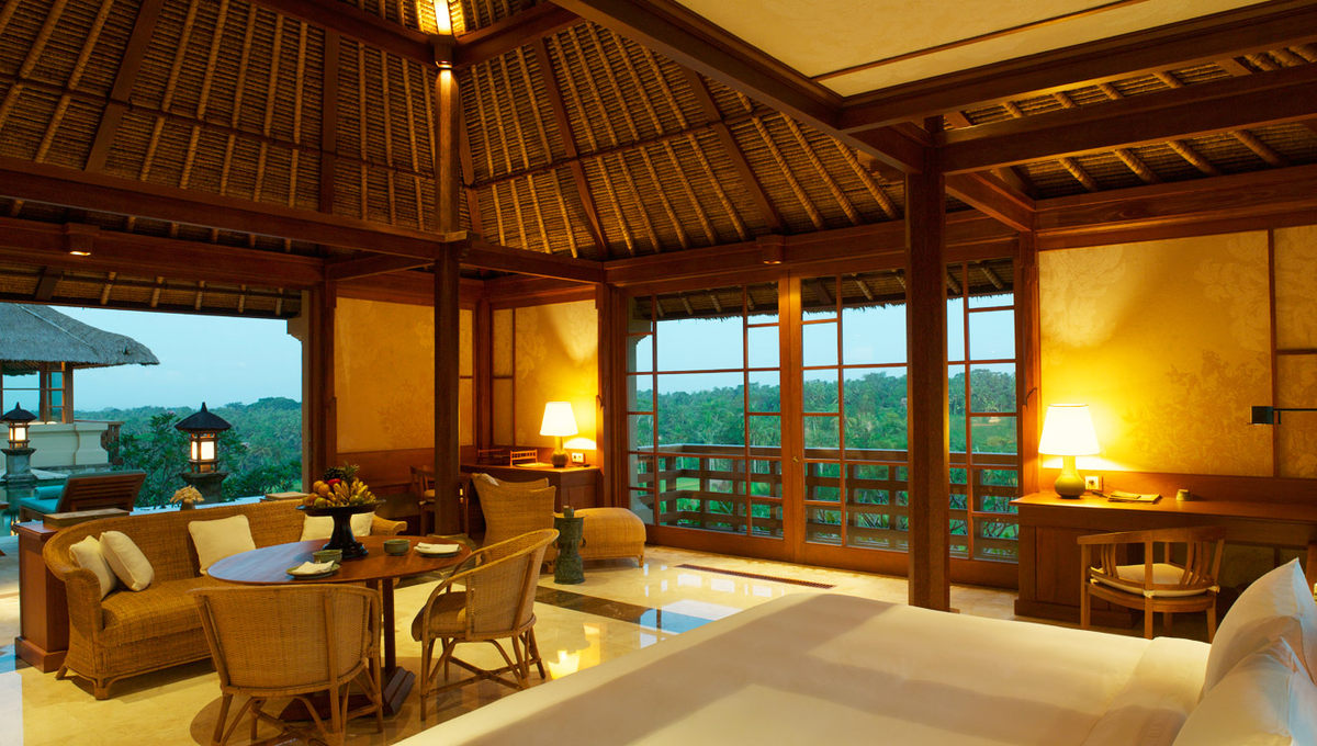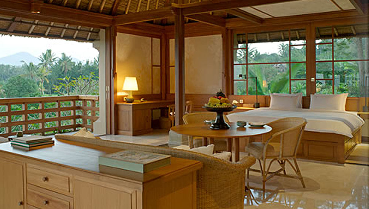 套房分为富士和单层两种,每个房间都采用浅色线条装饰,淡雅而低调,私人凉亭、手工细编的茅草屋顶、豪华四柱大床,组成一片格外宁静的个人空间。整扇的落地窗门三面通向露天花园和阳台,你可以在自己的别墅内欣赏河谷的雨林和水稻梯田,偶尔还会看到当地居民就在你的阳台外边采收农作物,颇有一番滋味。几乎和房间一样宽敞的大浴室一直延伸到室外,你可以充分体验在自然间沐浴所带来的惬意之感。