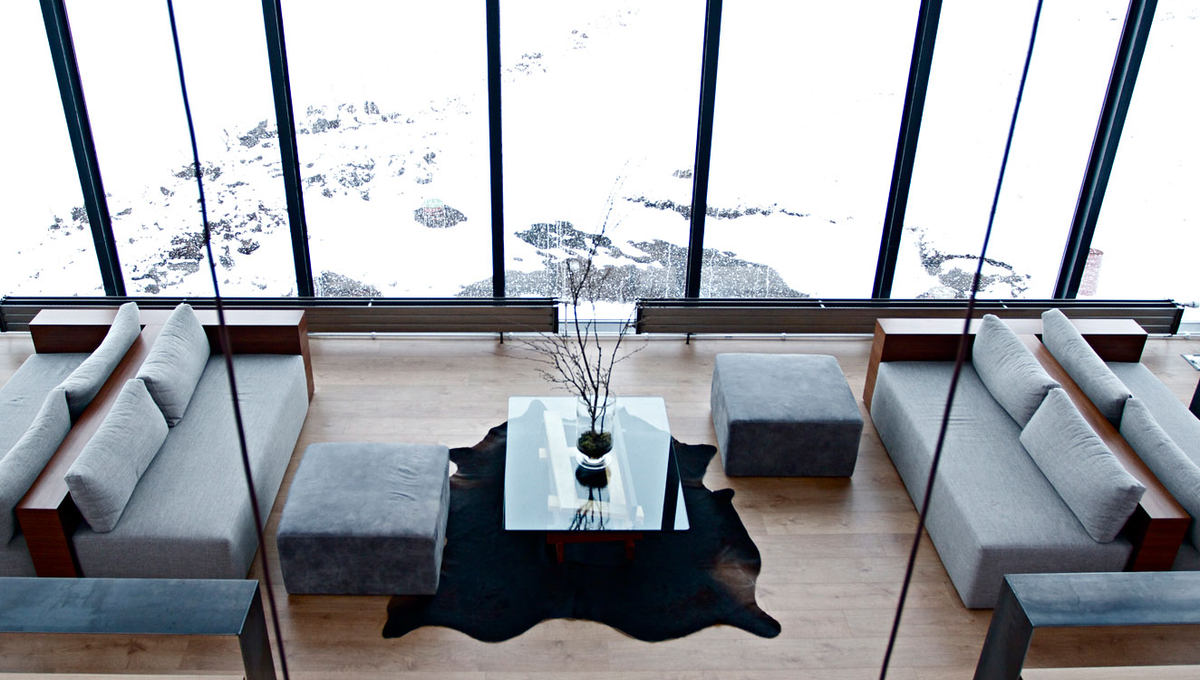 酒店的设计团队注意到建筑对于自然的深远影响,因此基于对自然的致敬,采用了新的再生材料,以大量水泥、木质与天然材质,进行了可持续性实践,让景观成为其中心主导。超大玻璃窗的大量运用,最大化了自然采光,减少了人工照明需求,使得全角度视野无阻挡。同时又能与周围的冰河峡谷地形形成巧妙的融合。