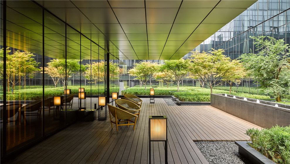 位于 3 层的富春居中餐厅供应融合北方特色的粤菜,厨师团队全部来自广东。餐厅中,琥珀色的琉璃搭配餐桌间的云纹木板隔档。菜品灵感源自餐厅背墙上的画作,木质菜单设计极像了古书。