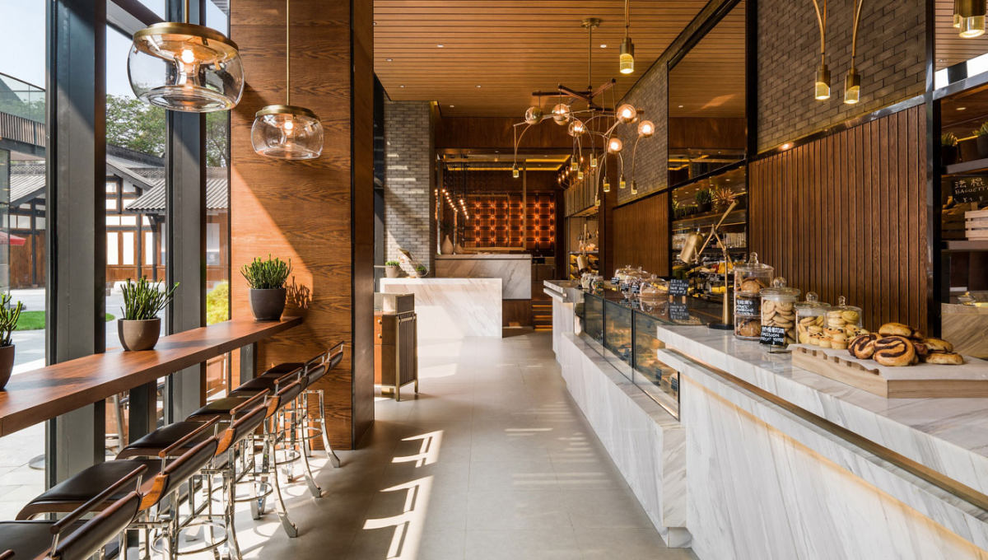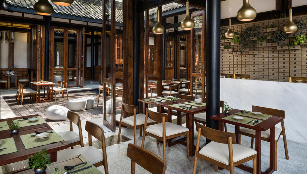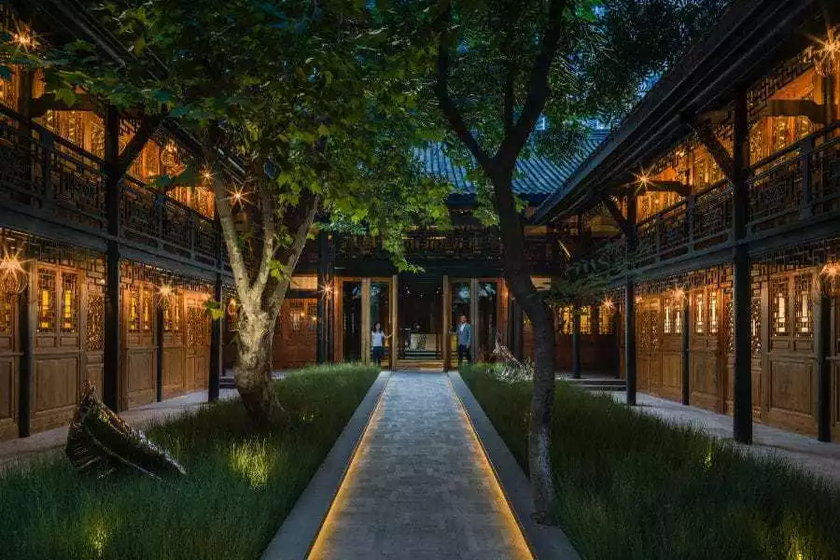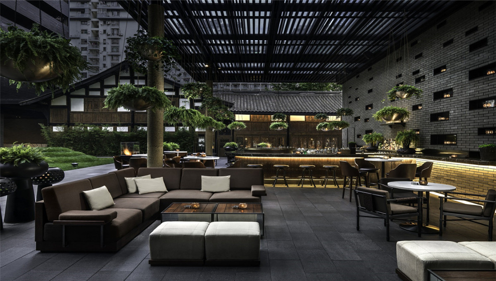 博舍由英国设计师事务所 MAKE Architects担纲设计。MAKE Architects凭藉创新和现代的建筑设计风格而获得赞誉,成功的融合各种对比强烈的元素。这个项目以笔帖式为中心,以一座清朝中式庭院建筑经过翻修后,作为酒店的入口。客房和住宅环绕着川渝地貌景观而建,竹苞松茂,,绿意盎然,恬静清幽,令人神往。