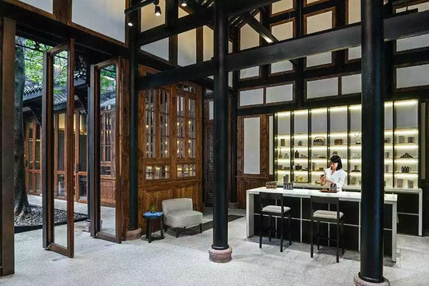 博舍是第三家太古酒店集团 The House Collective 品牌酒店,英文名称“The Temple House” ,以毗邻的大慈寺命名。灵感源自成都的传统文化和山川地貌,酒店虽然采用当代建筑风格,但同样尊重成都的历史建筑物并得到启发,重新修葺笔帖式街老宅院,并在设计之中融入清代庭院元素。