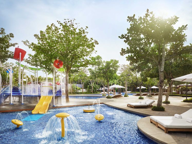 私人海域面积达20,000平方米,四周椰林掩映,天然沙滩也被复制过来;据说这里全天灌入一千万加仑的过滤海水,每32小时一换,确保水质洁净。将海水引入酒店内部的专属区域的设想实则惊为天人,虽然与大海并非无缝链接,但无疑刷新了传统海岛度假的理念--介于泳池和大海间的第三类水上活动方式--安全但同时提供惊险刺激的“海”上体验。