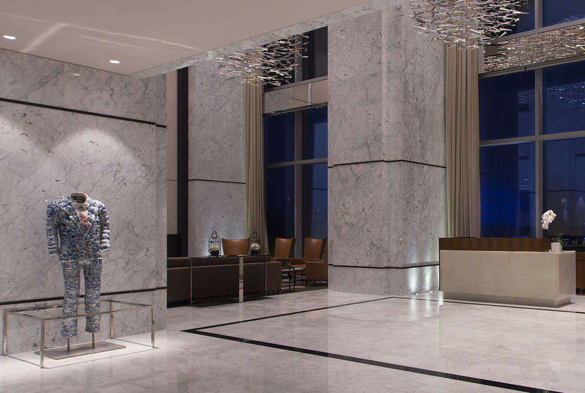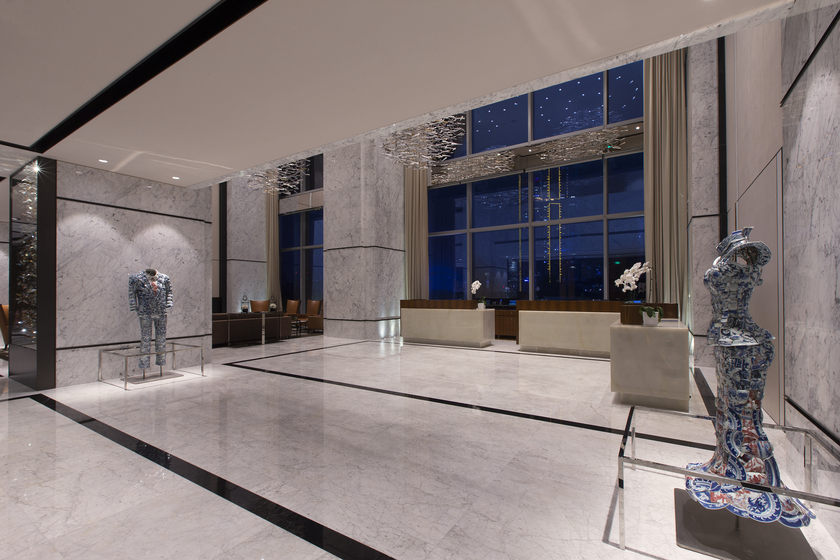 大堂中少见的Tiffany蓝主色调清新而醒目,上方悬浮着日本大师Sawada专门为尼依格罗设计的作品“鸟随风舞”,张向明先生的作品《北京女孩》出现在格外僻静的走廊,加上深色的沙发、浅色的圆桌,搭配三个别具一格的红色鸟笼,随时流露着平静而舒适的艺术美感。