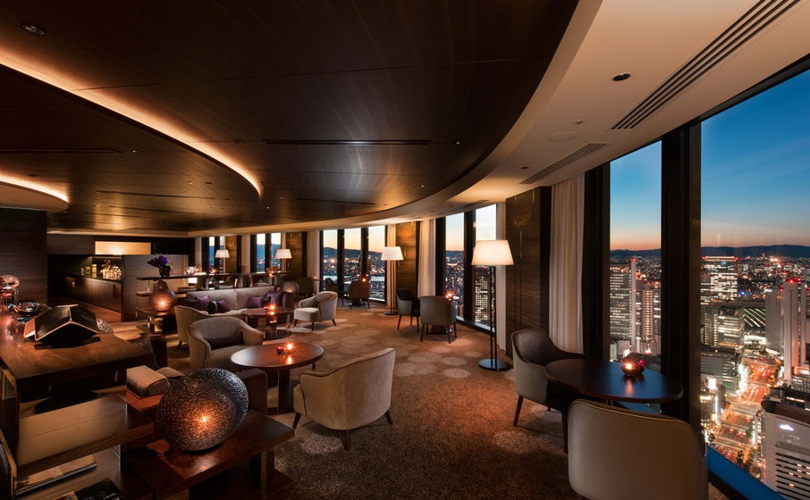 大阪康莱德酒店的 Sky Bar & Lounge 位于第 40 层的城市高处,是设在前台附近的迎宾大堂,可一览无余地欣赏江景和大阪天际线景观。