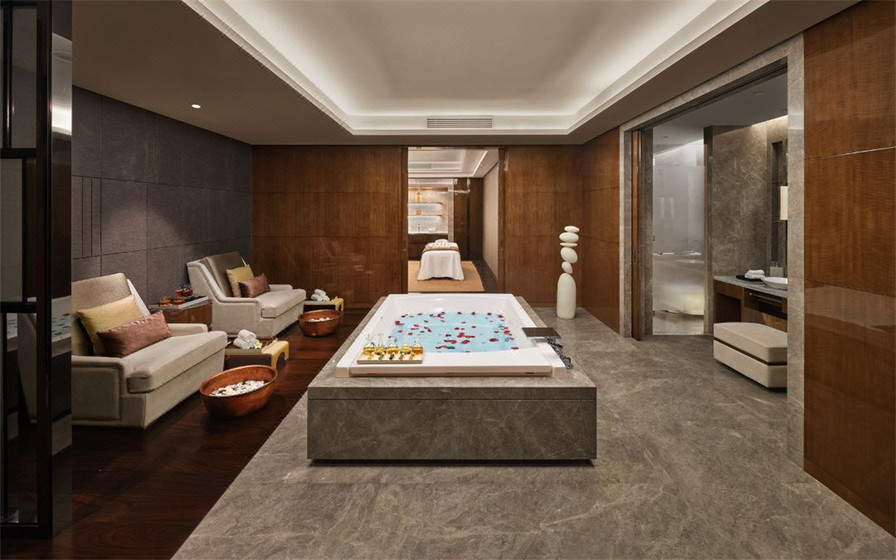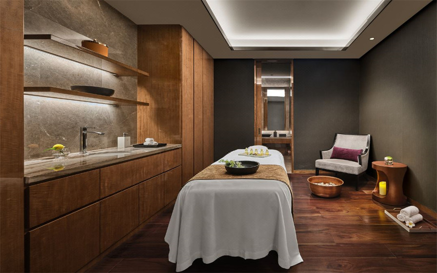 这里藏有八间安宁的私人水疗护理室,其中包含四间理疗室,两间绅士理疗室与两间VIP水疗套房,并设有淋浴房、香薰蒸汽房及桑拿房。水疗区域外,还设有传统中式足部按摩区、美甲区以及拥有室内游泳池的健身中心。