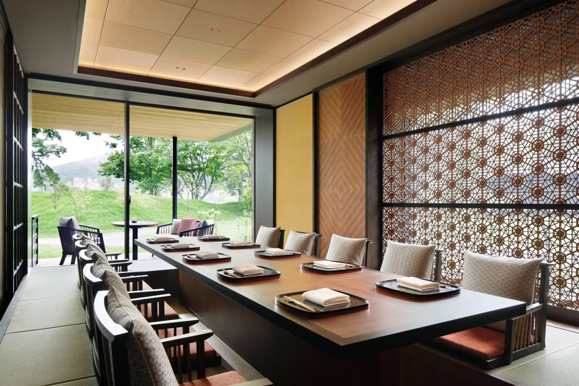 酒店崇尚天然,餐饮方面基于日本传统及手工艺术打造四种风格迥异的用餐体验:日式餐厅展示日本料理的活力元素;Lake House 选用当地食材,创造富有想象力的西式菜肴;酒吧在鸡尾酒中融合当地食材,诠释古城的精神;大堂酒廊为宾客打造放松休憩之地,品尝下午茶和美味小食,俯瞰群山美景。新鲜食材通过精挑细选的器皿,以创意摆盘,让每道菜品和饮品都折射出丰富的当地文化。