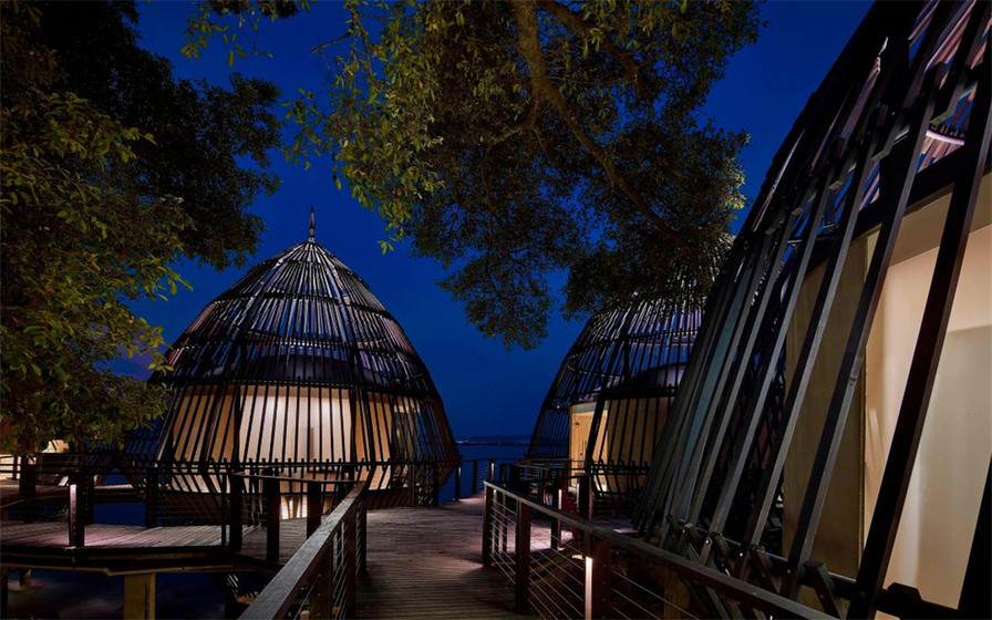 酒店被安静迷人的海湾所环抱, 周遭遍布古老的热带雨林;驻足自然质朴的海滩即可将安达曼海的壮观景致尽收眼底。兰卡威丽思卡尔顿酒店环境别致非凡, 只有亲身下榻方可领略当地的缤纷美景!酒店建筑与周边自然环境和谐相融, 采用现代风格设计并融入当地建筑和本土艺术的精致元素。其通风精致的氛围、非凡隐蔽性和壮美全景, 令每间套房和别墅各有特色。酒店的三层玻璃塔楼建筑掩映在茂密丛林中, 富有未来感;雨林别墅设有落地窗, 供您近距离观赏野生动物。绵延沙滩和水上别墅坐拥壮阔海洋和日落美景, 令人叹为观止。