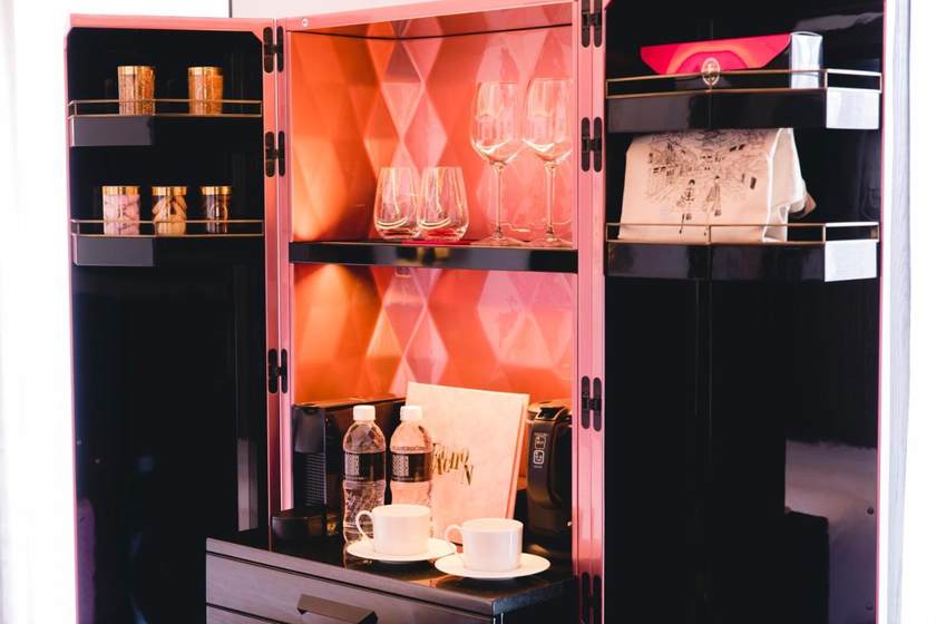 每间都设置了免费美食吧,以黑、白、金色为主色调,采用 Fauchon 粉色作为配色,并融入和纸、京西阵金襕等日式材料,让人感受到京都与巴黎的融合之美。房间十分可爱,非常适合女生一起入住。