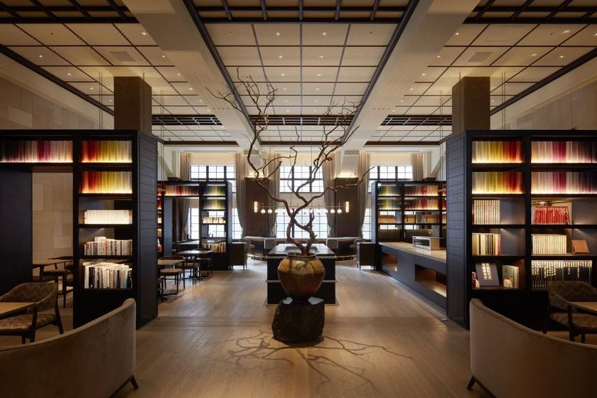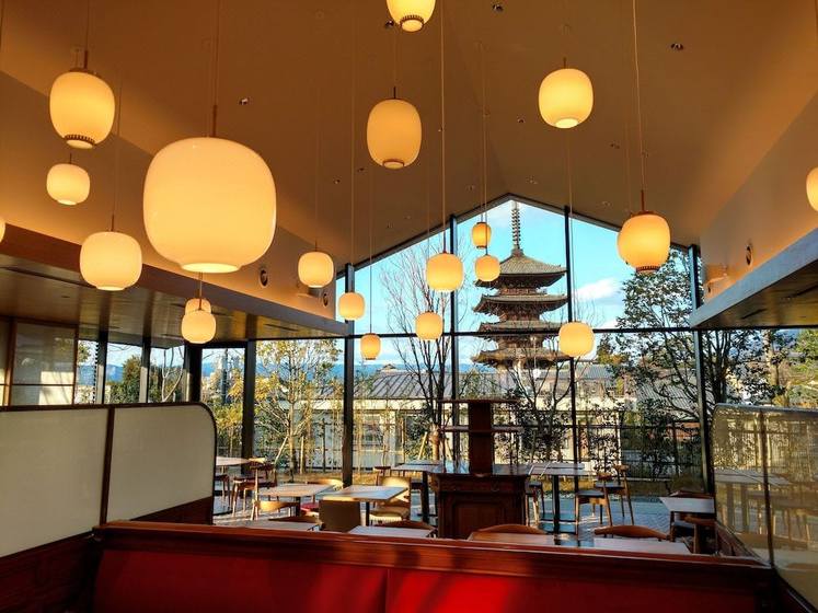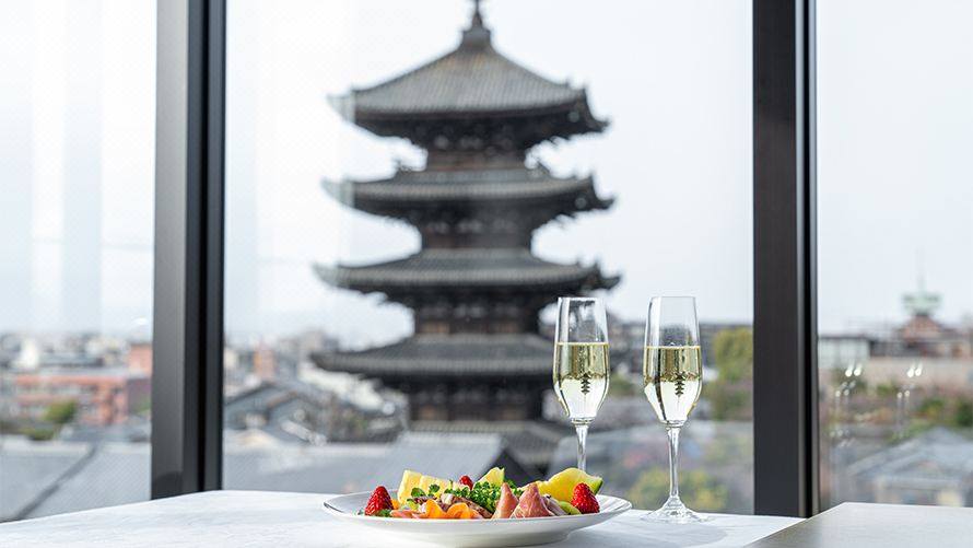 住宿客人可使用的休憩厅。透过阳光倾注而下的大玻璃窗,能从正面欣赏到“法观寺”八坂塔的风姿。早晨,可以享受一杯美味的现磨咖啡;而在夜间,则可以一边欣赏华灯初上的饭店建筑之美,一边享用饮品和冷盘佳肴。
