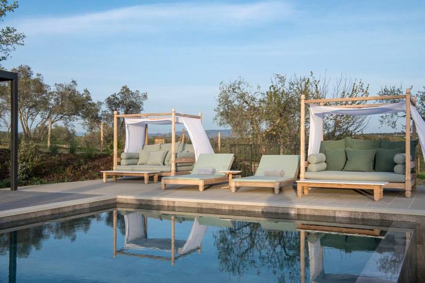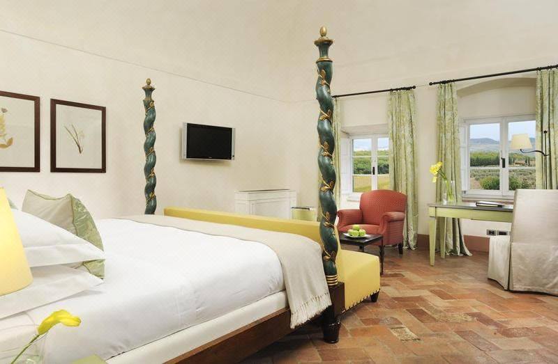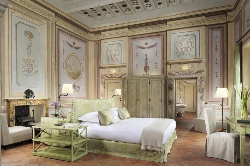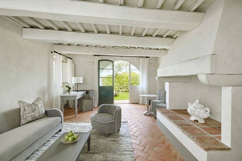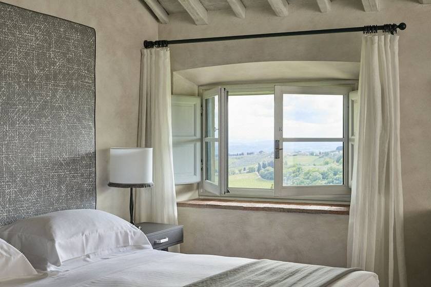 酒店拥有 50 间客房和套房,采用 Paola Navone 设计的简约冷色调内饰。这些低调的风格与文艺复兴时期的壁画和柔软的赤陶地板并列,营造出反映其历史和周围山丘泥土之美的客房。