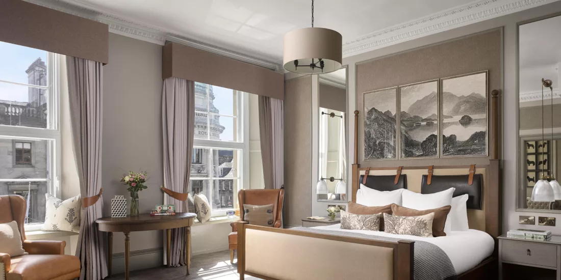 爱丁堡皇家乔治洲际酒店地理位置优越,您可以在新旧城区之间漫步,探索历史古迹、著名景点以及豪华购物和餐饮场所。酒店耗资数百万英镑进行细致的修缮和翻新,采用了橡木、大理石和皮革等奢华的天然材料,并从 19 世纪伟大的苏格兰风景画家那里汲取了灵感,为酒店定下了柔和的色调。酒店的客房温馨而富有特色,色调清新而内容丰富如家般温馨舒适的客房却不乏奢华典雅。酒店还拥有富丽堂皇的国王大厅,是举办婚礼和庆典的热门之选,另外还有七间会议室和活动室以及一间新装修的健身房。