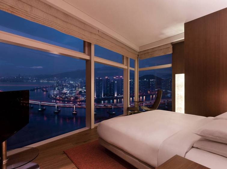 五星级的釜山柏悦酒店位于海云台区,毗邻釜山码头,距离海云台海滩(Haeundae Beach)仅有2公里,提供豪华的住宿和精致的客房和套房。酒店位于30楼,设有空中大堂,为客人提供免费WiFi和免费私人停车位。