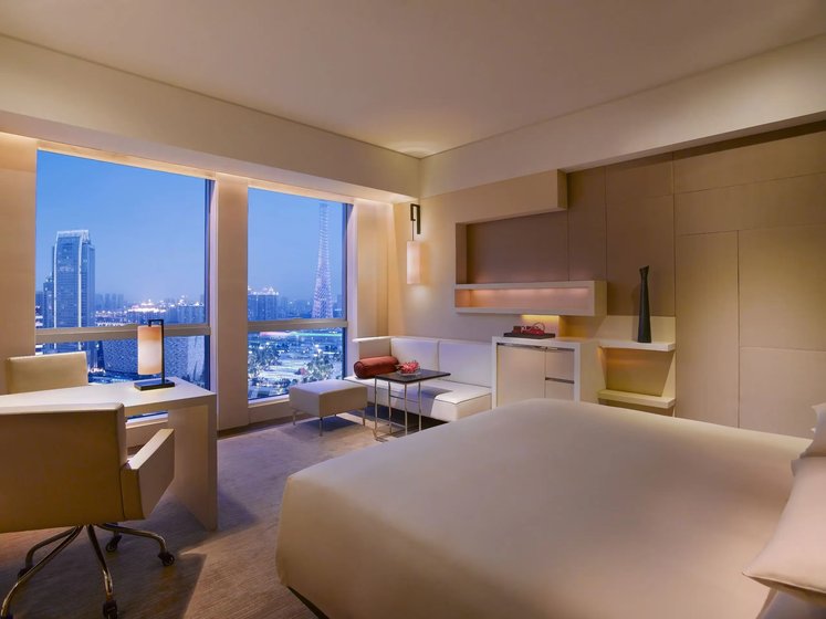 368 间现代高雅的客房,包括 25 间套房。客房面积由 45 平方米至 270 平方米。房间设计时尚别致,木材和大理石镶嵌的地板,与各种高科技设施相得益彰。浴室设有云石浴缸和热带雨林淋浴间,落地玻璃窗可让客人饱览广州新中轴线及珠江新城美景。