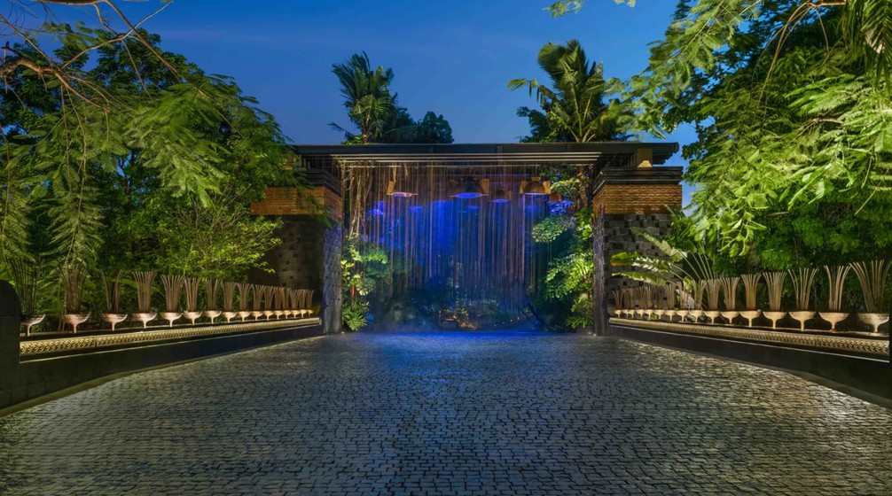 巴厘岛瑞吉度假酒店坐落在风光秀美、静谧宜人的努沙杜瓦海滩上, 金黄色的沙子连绵不绝。一进入酒店大堂便有音乐家弹奏传统的铃地克乐曲, 每天晚上日落时间, 在大楼梯处上演精彩的火焰舞蹈。