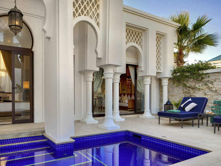 在奢华的室外游泳池中,毗邻地中海,周围环绕着郁郁葱葱的花园,所有这些都与优雅的阿拉伯和安达卢西亚建筑设计相得益彰