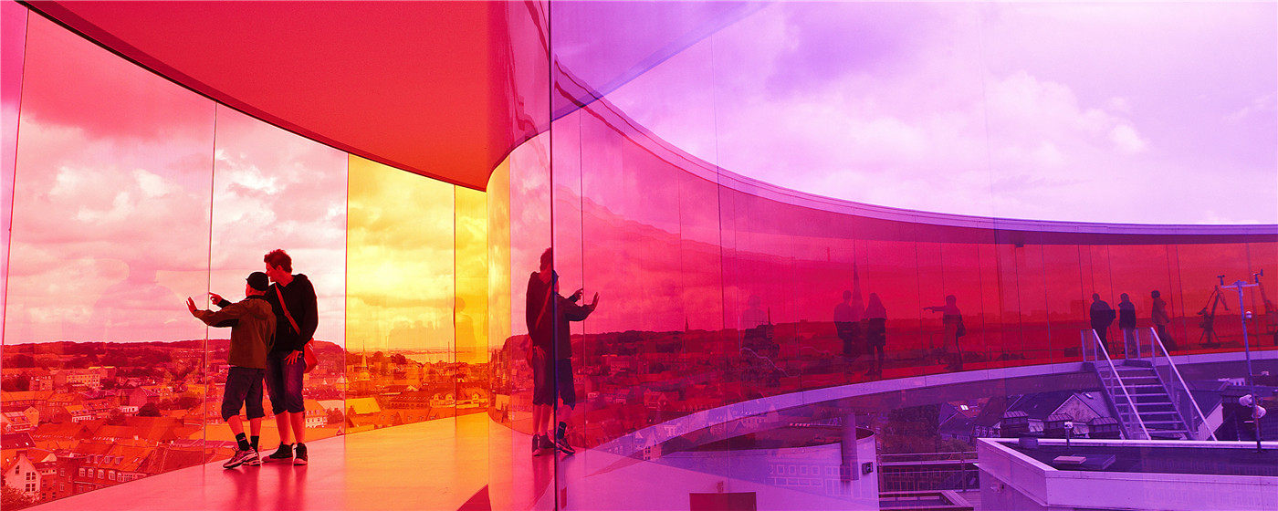 下午前往奥胡斯的Aros Aarhus 美术馆,这座美术馆最令人惊喜的地方是冰岛艺术家Olafur Eliasson悄悄地把天上的彩虹搬挪到奥胡斯的Aros Aarhus 美术馆屋顶。透过这条直径52米由光谱颜色组成彩虹般色彩的大玻璃走廊,可以360º观赏整个奥胡斯的城市风貌。