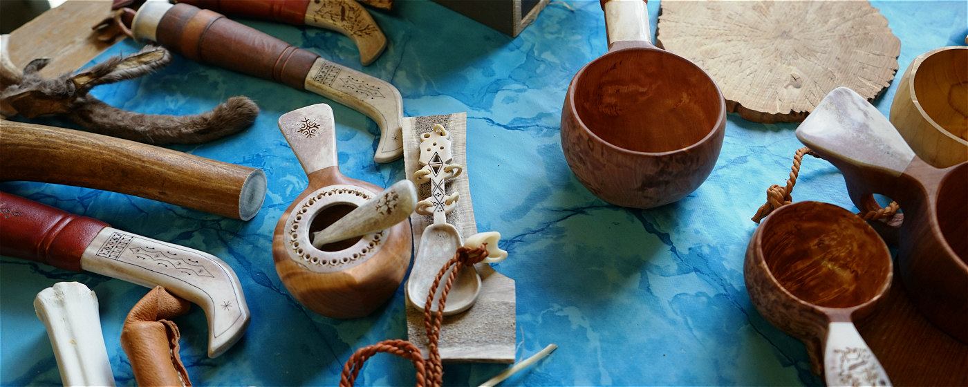 关闭早餐后,参观鹿角工坊。生活在芬兰北部奥纳斯河流域的拉普兰人,珍爱着古老的生活传统,世代传承着手工制作的技艺。设计师艾琳和埃利夫妇将自己的鹿角工坊建造于此。夫人Irene设计lappish元素的服装、首饰、配饰、雕刻等,先生Ari是以鹿角为主要原料制作灯具、手工芬兰刀的行家里手。他们家出品的鹿角灯价格不菲,在罗凡涅米甚至整个芬兰都非常著名。拉普兰旷野中的天然材料是设计师创作的源泉。鹿角工坊的产品都是由驯鹿皮、驯鹿角、桦树皮、枯木和桦树根瘤制作而成。这些原生态的素材,经过设计师的艺术加工,变成了精美的刀具、皮鼓、勺子、调味罐以及各种饰品。在鹿角工坊,您可亲自体验用鹿皮鹿角只做您心仪的小物品。