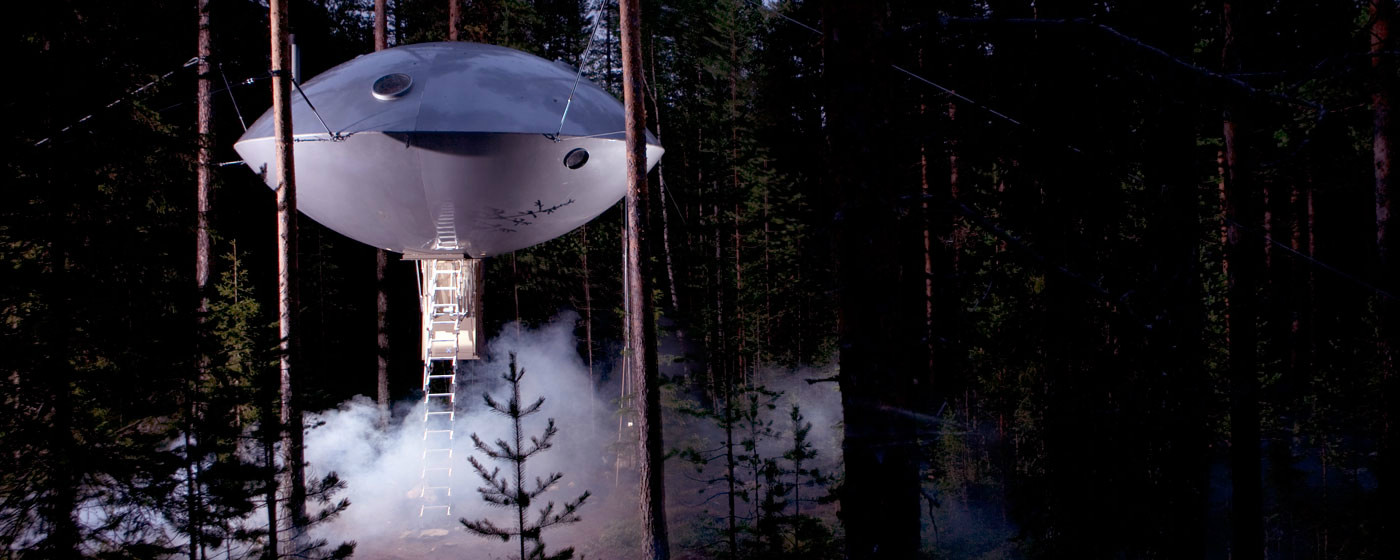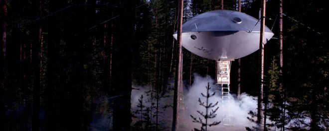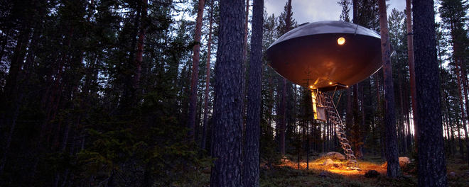 在北欧人的心目中,树木对于人类具有非凡的意义。在瑞典北部拉普兰地区风景如画的哈拉斯村,隐匿着这样一家举世无双的树屋酒店(Tree Hotel),6间独一无二的主题房间散落在幽静的森林中——鸟巢、镜魔方、机舱、蓝椎体和UFO——迥异的外形、内饰与家具,甚至灯光分别由六位知名建筑师设计完成。
