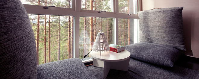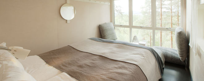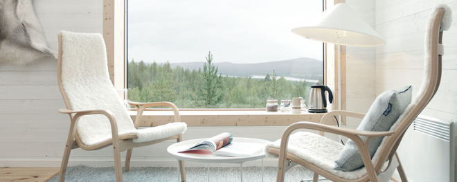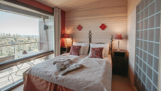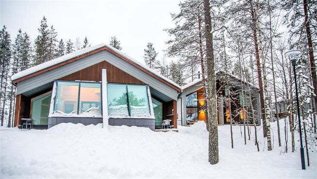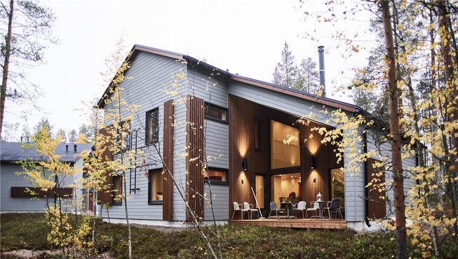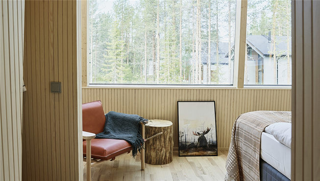 酒店的每间公寓都是半独立式别墅,以斯堪的纳维亚风格精心设计,全景窗户带给客人绝佳的风景视野,四周的森林仿佛就在房中,在冬季的夜晚还有机会看到极光。公寓内设有开放式壁炉、私人桑拿浴室、露台和设备齐全的厨房。