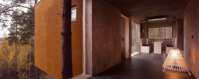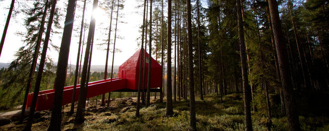 树屋,顾名思义,即盖在树上的屋子。这个奇思妙想来自奥格森的一部纪录片《Treelover》。影片讲述三个男人从城市逃离,开始寻根之旅。因为对家乡的热爱,他们共同建造了一座树屋。这部充满哲学意味的片子讲的是人与树的故事,传达了这样一个信息:无论从历史还是文学角度看,树木对于人类具有非凡的意义。如今,瑞典的树屋酒店将这部电影搬到现实生活中。酒店创始人邀请到瑞典知名的设计师和建筑师,力图将人与自然和谐共生的一幕定格,并永久地留存在人们的心中。