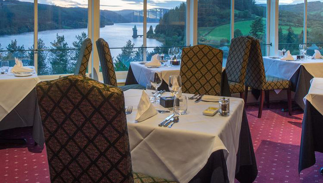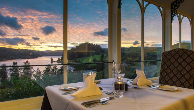 晚餐推荐:Lake Vyrnwy Hotel & Spa 酒店中的 Tower Restaurant 为北威尔屡获“AA Rosette”殊荣的餐厅之一。