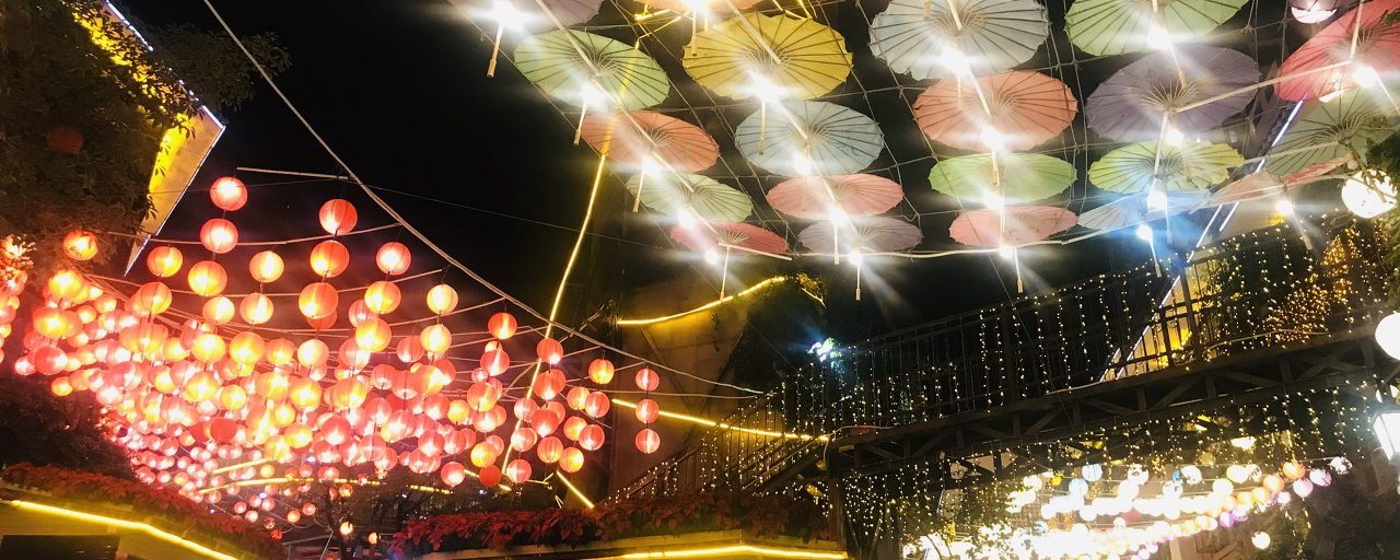 夜色渐浓,华灯初上,走进紫陶街,整条街道的空中都悬挂着古色古香的油纸伞、七彩的灯笼,各家商铺的门前、窗下和树上也挂满了红灯笼和金星一般闪闪烁烁的小彩灯,整条街道流光溢彩、梦幻迷离,此情此景,恰似辛弃疾笔下的美景再现:“东风夜放花千树,更吹落,星如雨。”