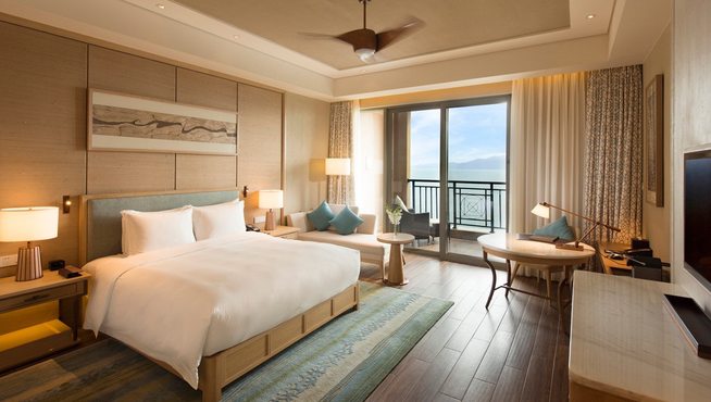 346间客房套房设计时尚现代,私密空间给人以宽阔视野。透过落地窗,水天一线的景色尽收眼底。