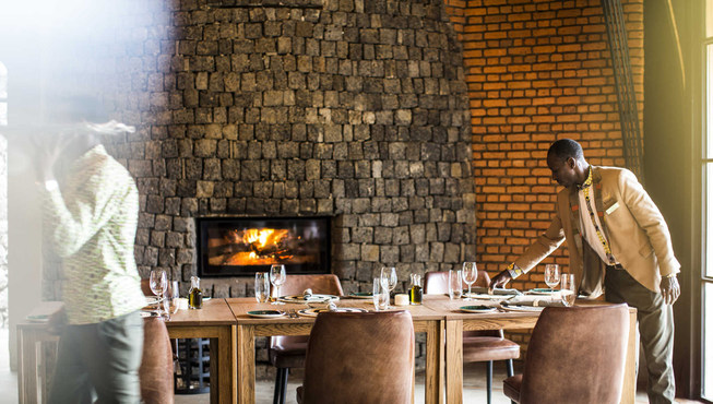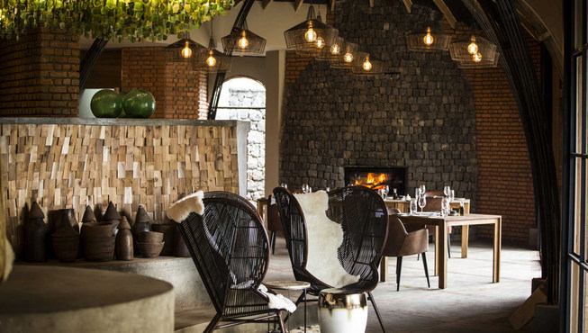 Wilderness Safaris Bisate Lodge 毗邻火山国家公园,Lodge 位于一个被侵蚀的火山锥的天然圆形剧场,身在 Lodge 内即可观赏壮观的火山景色。