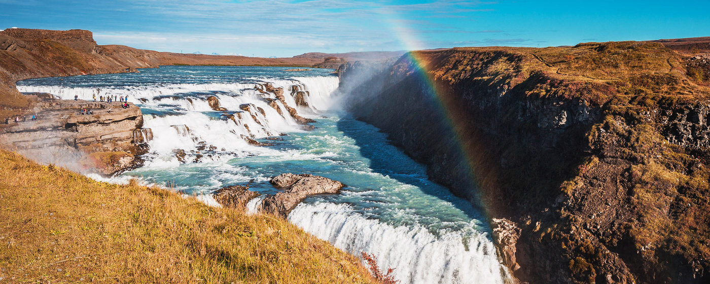 黄金瀑布是冰岛最大的断层瀑布,宽约2,500米,滔滔河水奔腾咆哮,轰鸣中直泻32米,又急坠于72米深的峡谷之中。