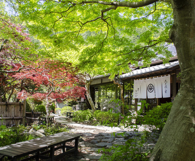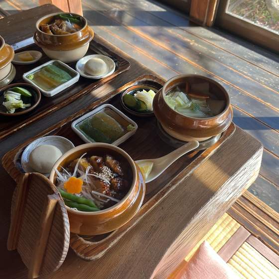 中午为您安排了一个由古民居改造的特色釜饭餐厅,有着三十多年的历史,提供有户外庭院的座位,还可以品尝奥多摩特有"三倍体"养殖的鲑鱼,当地蘑菇竹笋等野生蔬菜的料理也是招牌。